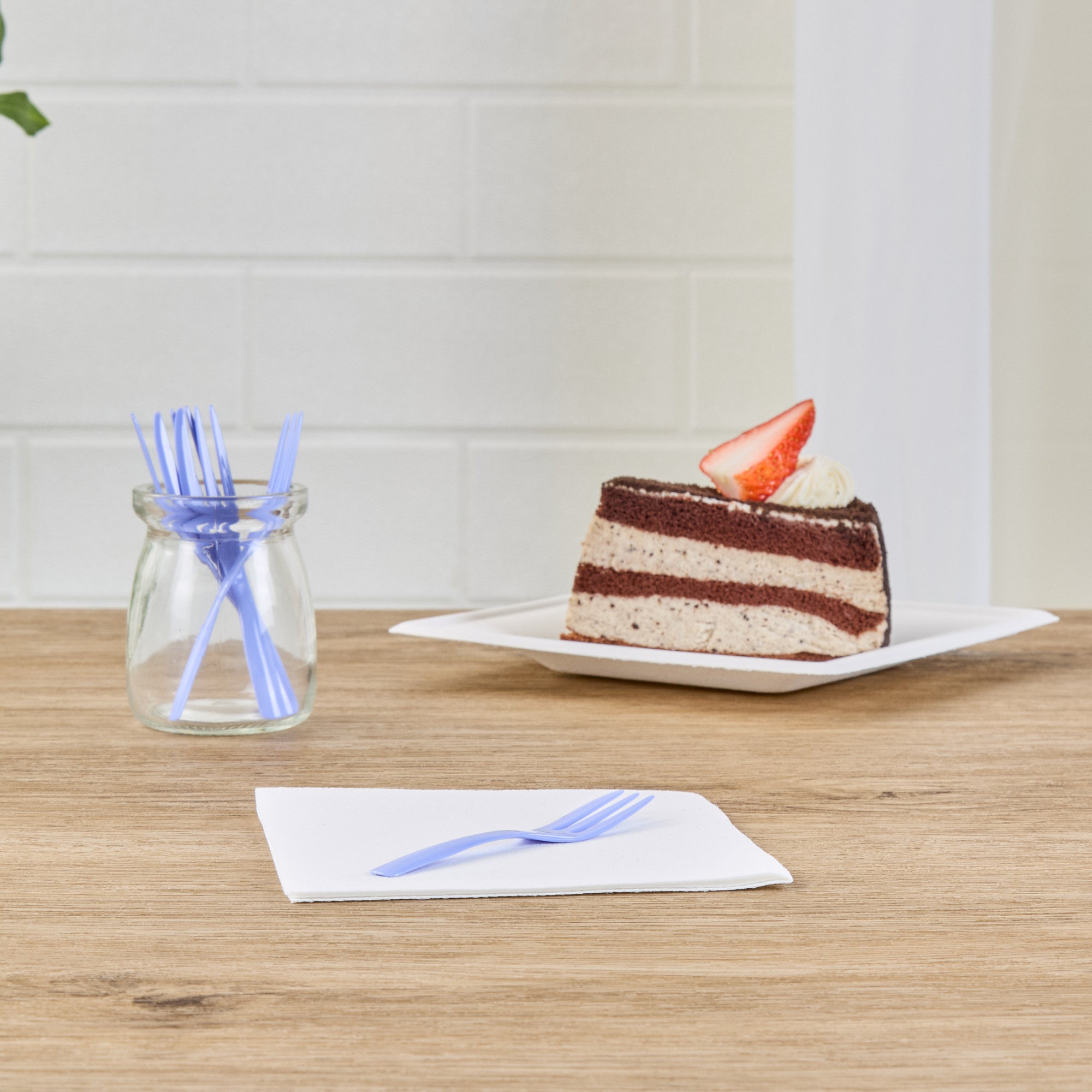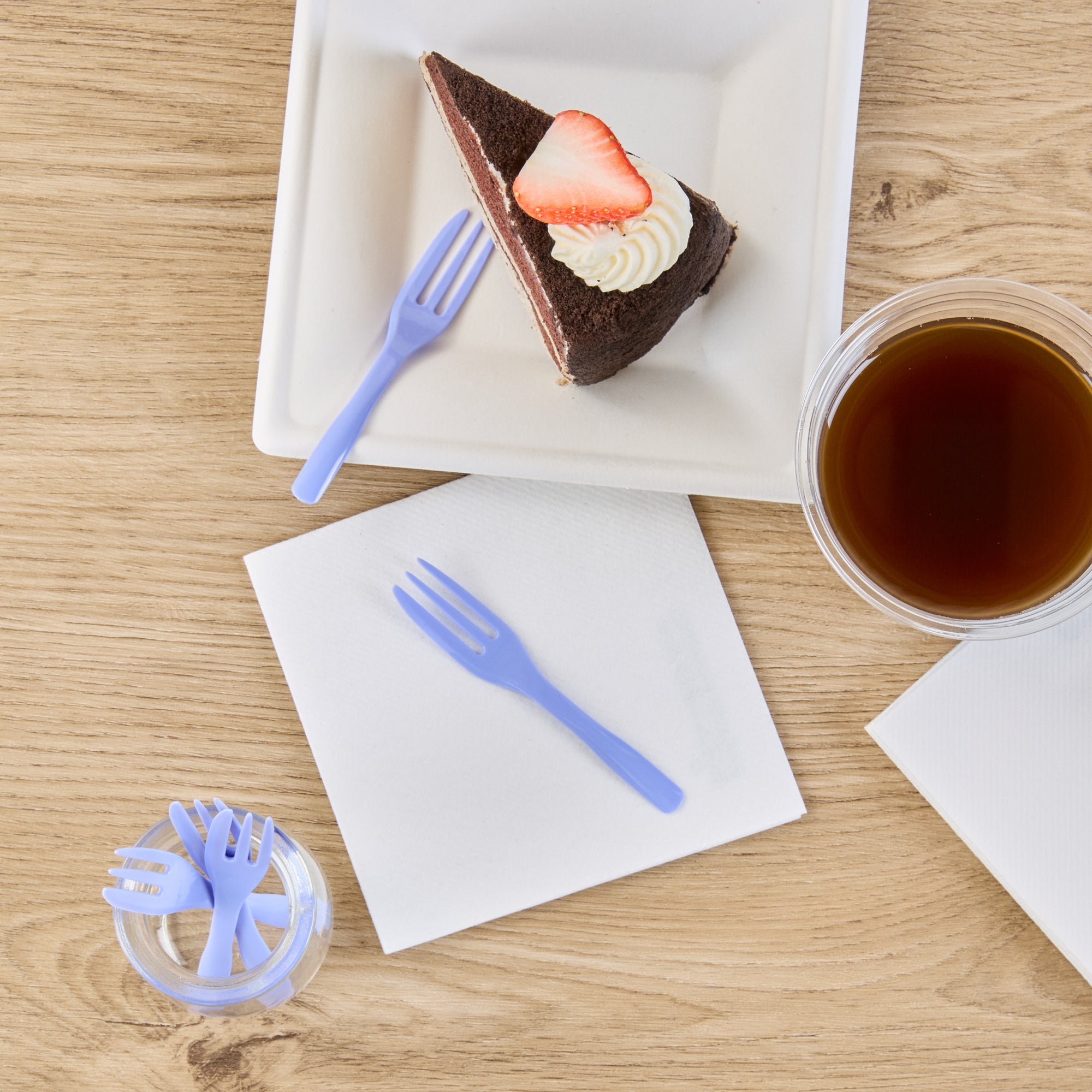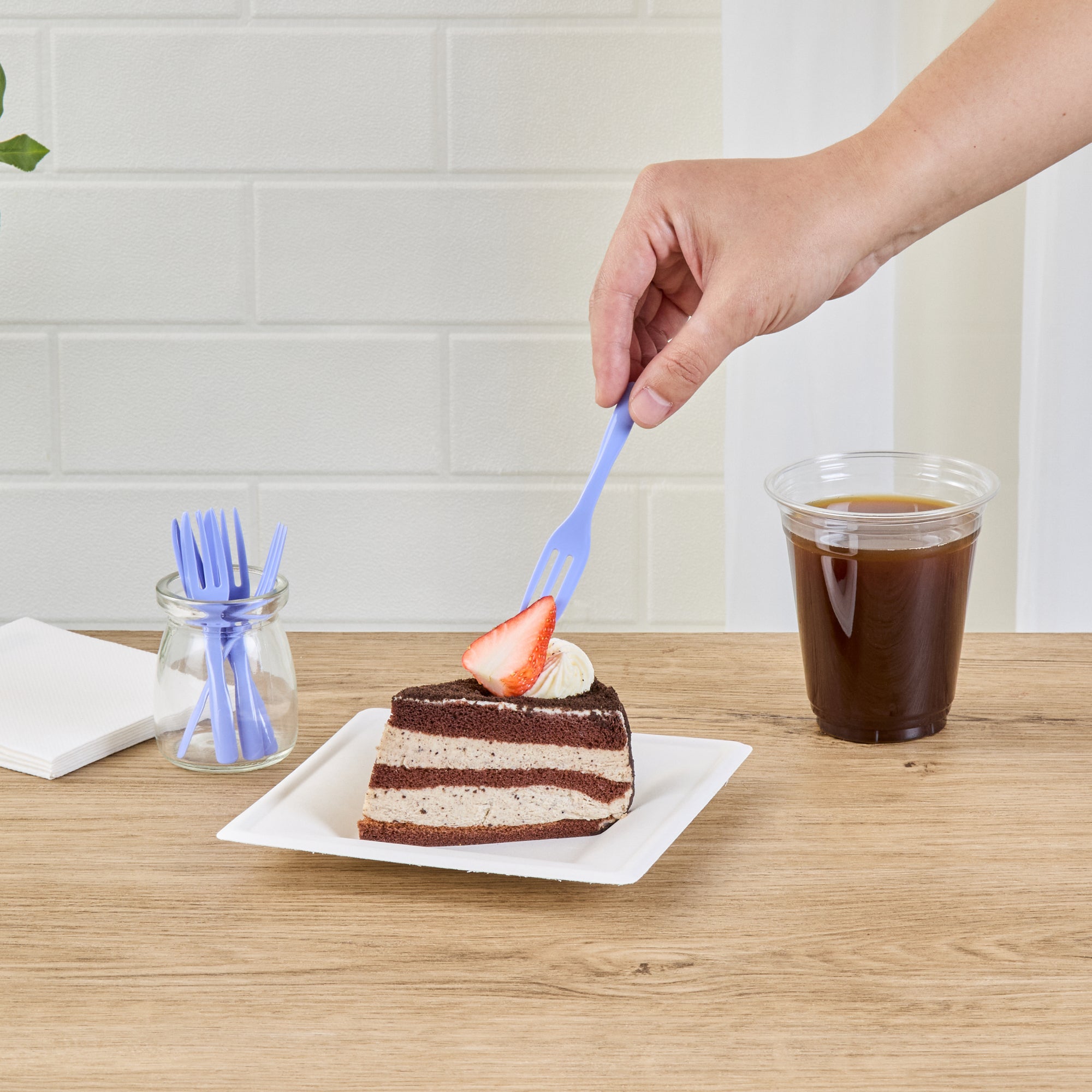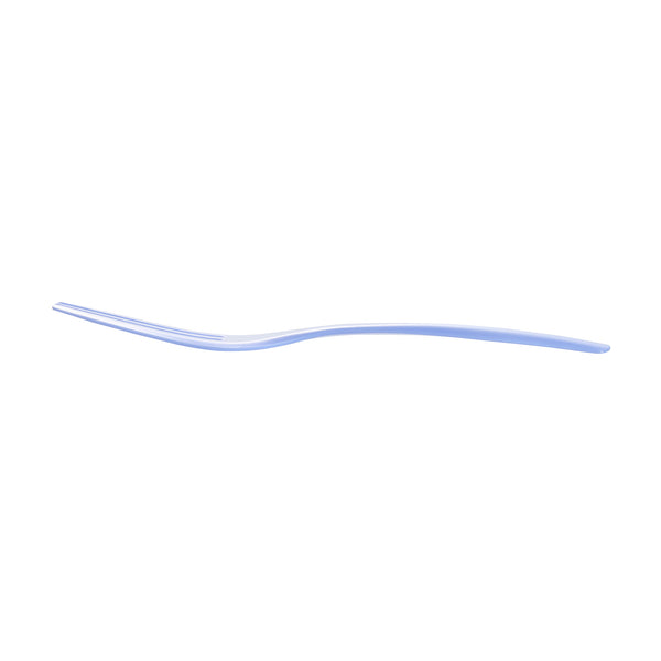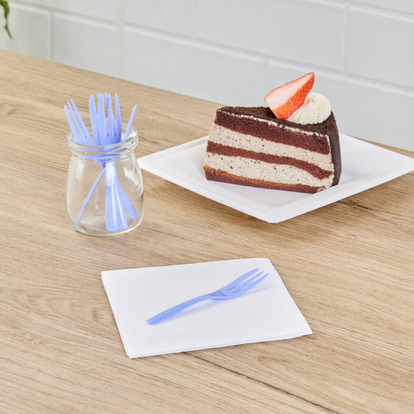 Enjoy a perfect bite every time with our Coppetta Periwinkle Plastic Cake Forks with Knife Edge. These fruit forks are crafted from premium plastic and are designed to stay strong and sturdy against hefty food bites. Featuring a wide knife-edged end, these cake forks can smoothly slice through the golden brown crust of a lattice-topped fruit cobbler or the thick fondant frosting of an elegant wedding cake. With their effervescent periwinkle finish, these disposable forks expertly enhance the presentation of your delicious desserts. To avoid washing and scrubbing after events, these dessert forks are disposable. Measuring 4 inches in length by 0.75 inches in width, these plastic forks are ideal for all kinds of catered parties. Sold in a 100 count box.