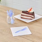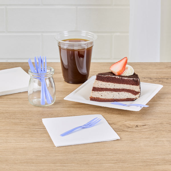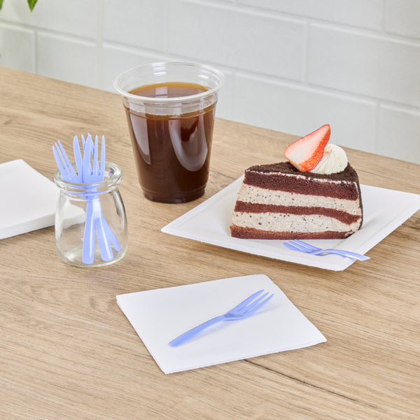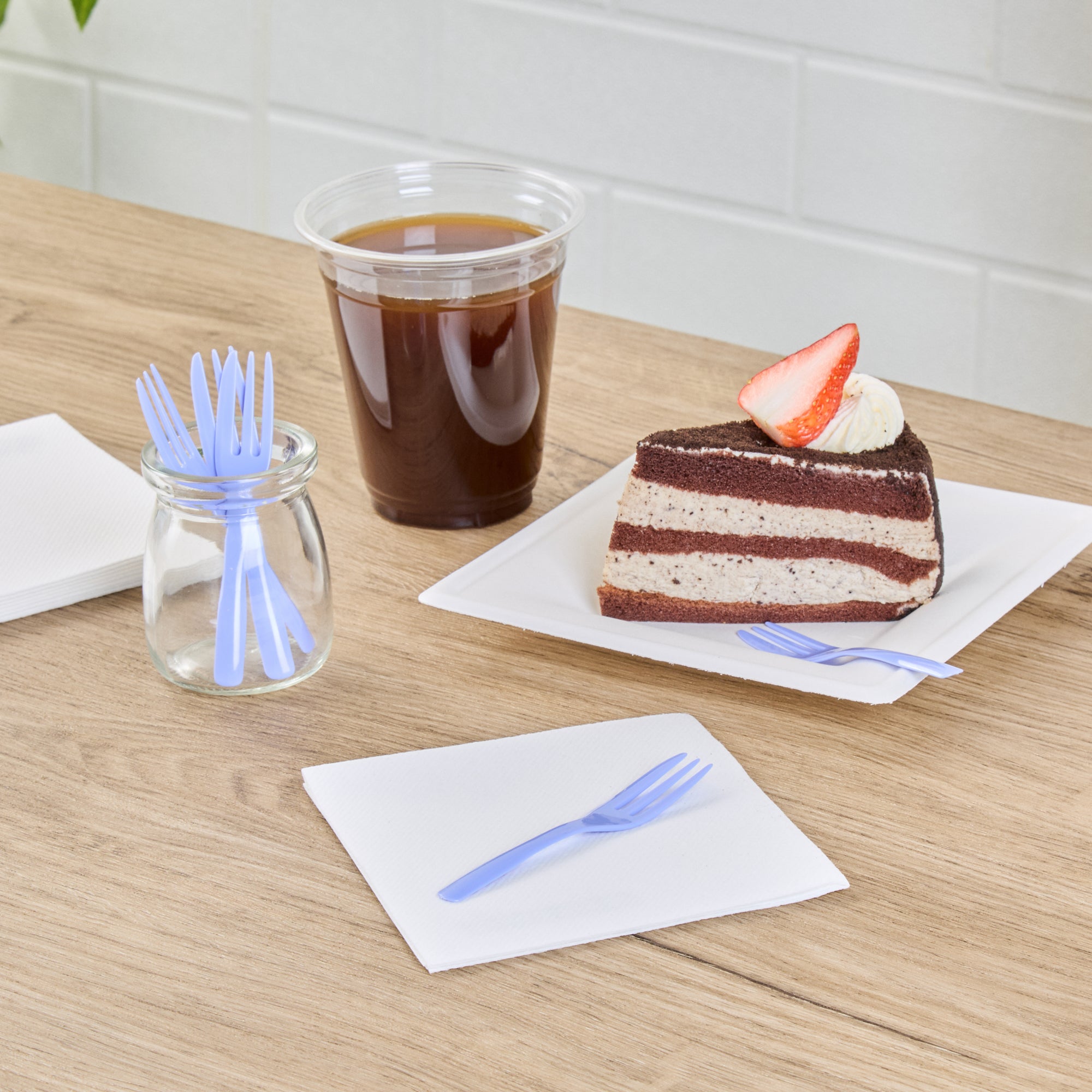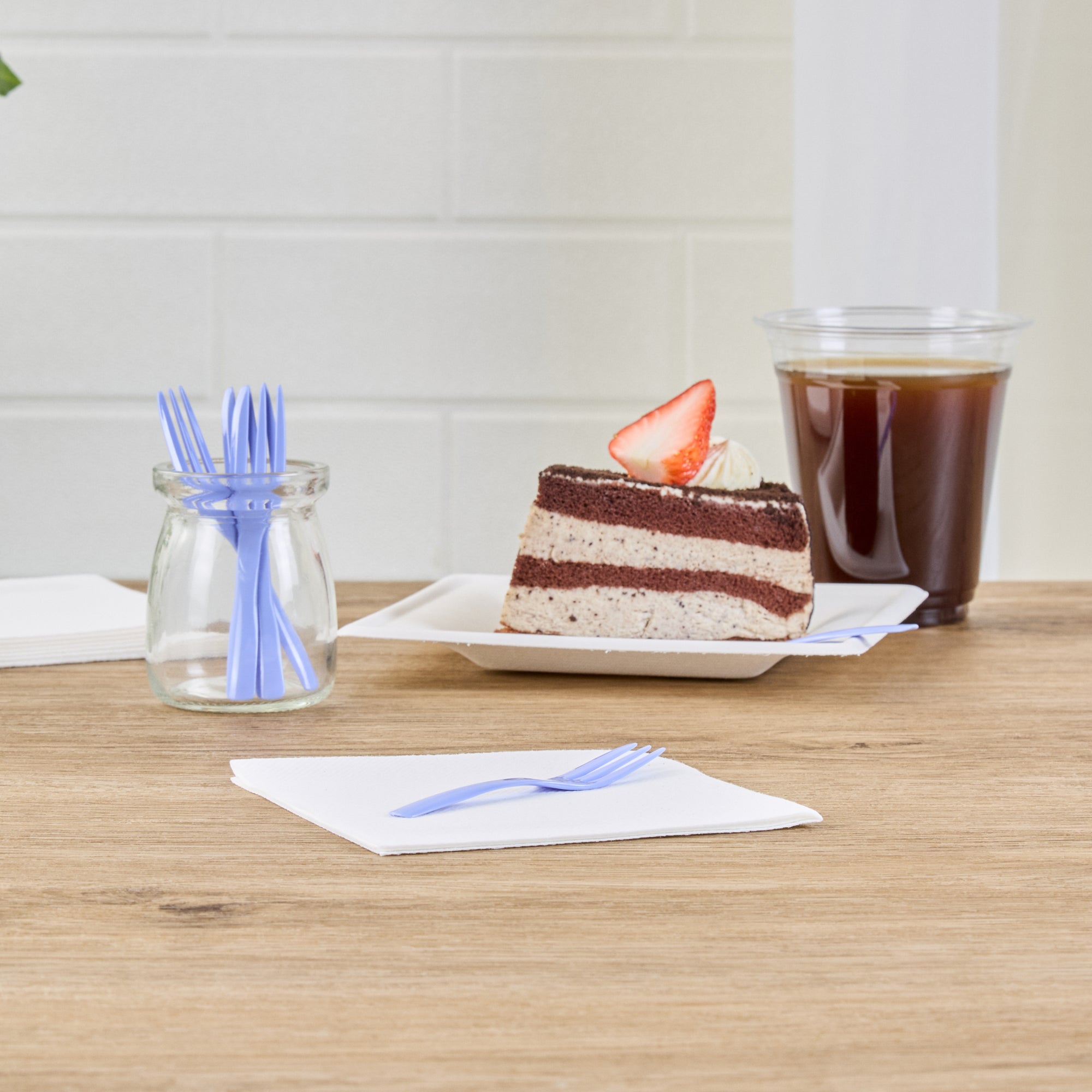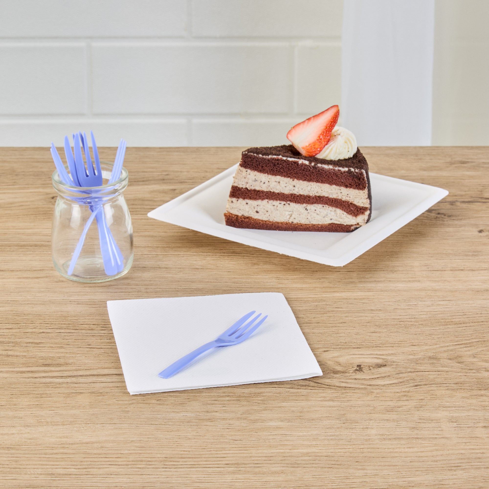 Enjoy a perfect bite every time with our Coppetta Periwinkle Plastic Cake Forks with Knife Edge. These fruit forks are crafted from premium plastic and are designed to stay strong and sturdy against hefty food bites. Featuring a wide knife-edged end, these cake forks can smoothly slice through the golden brown crust of a lattice-topped fruit cobbler or the thick fondant frosting of an elegant wedding cake. With their effervescent periwinkle finish, these disposable forks expertly enhance the presentation of your delicious desserts. To avoid washing and scrubbing after events, these dessert forks are disposable. Measuring 4 inches in length by 0.75 inches in width, these plastic forks are ideal for all kinds of catered parties. Sold in a 100 count box.