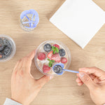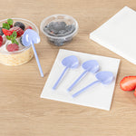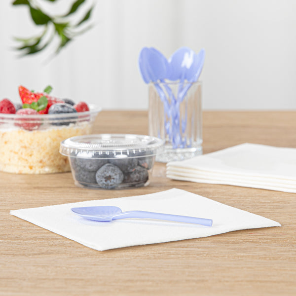 Ensure that every ice cream you serve is memorable with our Coppetta Periwinkle Plastic Love Shovel Spoons. Featuring an enticing shovel-shaped design, these mini dessert spoons are perfect for scooping up heaping spoonfuls of swirled frozen yogurt. The strong and sturdy plastic construction of these recyclable dessert spoons makes it easy to maneuver through big bowls of desserts without bending or breaking. With their slender shovel-like handle, these heart shovel spoons are designed to be easy to grip. Plus, the ultra-stylish effervescent periwinkle finish of these adorable dessert spoons makes them perfect additions to trendy ice cream parlors. These heart-shaped shovel spoons measure 3.5 inches in length by 1.25 inches in width. Sold in a 500 count box.