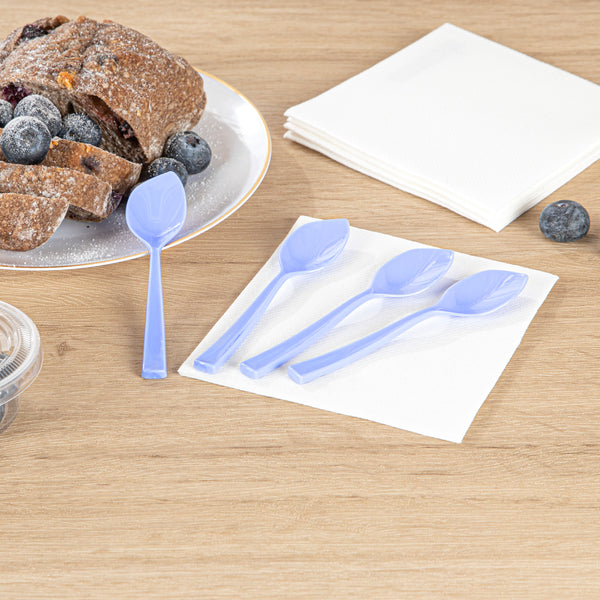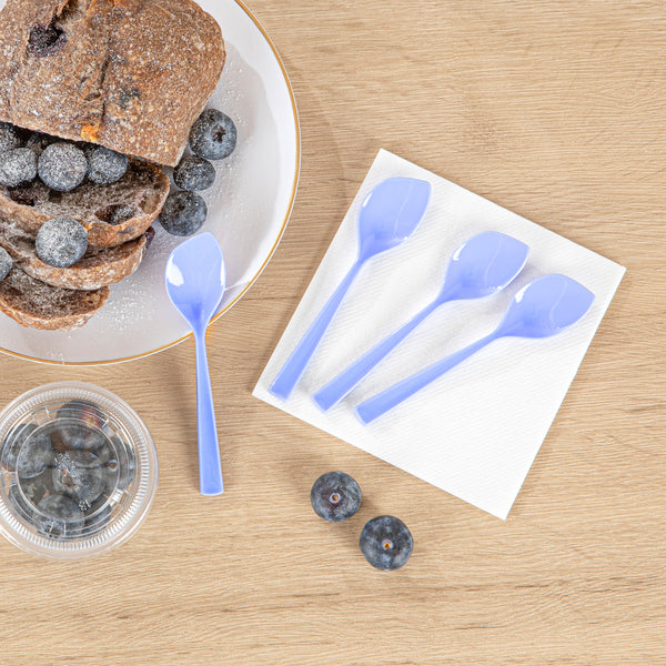Bring a playful pop of color to your freshly scooped ice cream with our Coppetta Periwinkle Plastic Petal Spoons. Made from premium plastic, these frozen yogurt spoons have strong and sturdy handles that are built to resist breaking under the weight of heavy bites. Featuring a unique shovel-like shape, these small dessert spoons are excellent tools for enjoying giant ice cream sundaes and big bowls of gelato. The sleek pointed tip of these disposable spoons effortlessly slides into tightly packed scoops of ice cream and towering mounds of sorbet. With a unique angled shape, these plastic spoons ensures that your customers can easily scoop up every last delicious bit. For a swift after-service cleanup, these petal spoons are disposable. Each cake spoon measures 4.5 inches in length by 1 inch in width, making them ideal for serving alongside all types of frozen treats and delectable desserts. Shipped in a 500 count box.