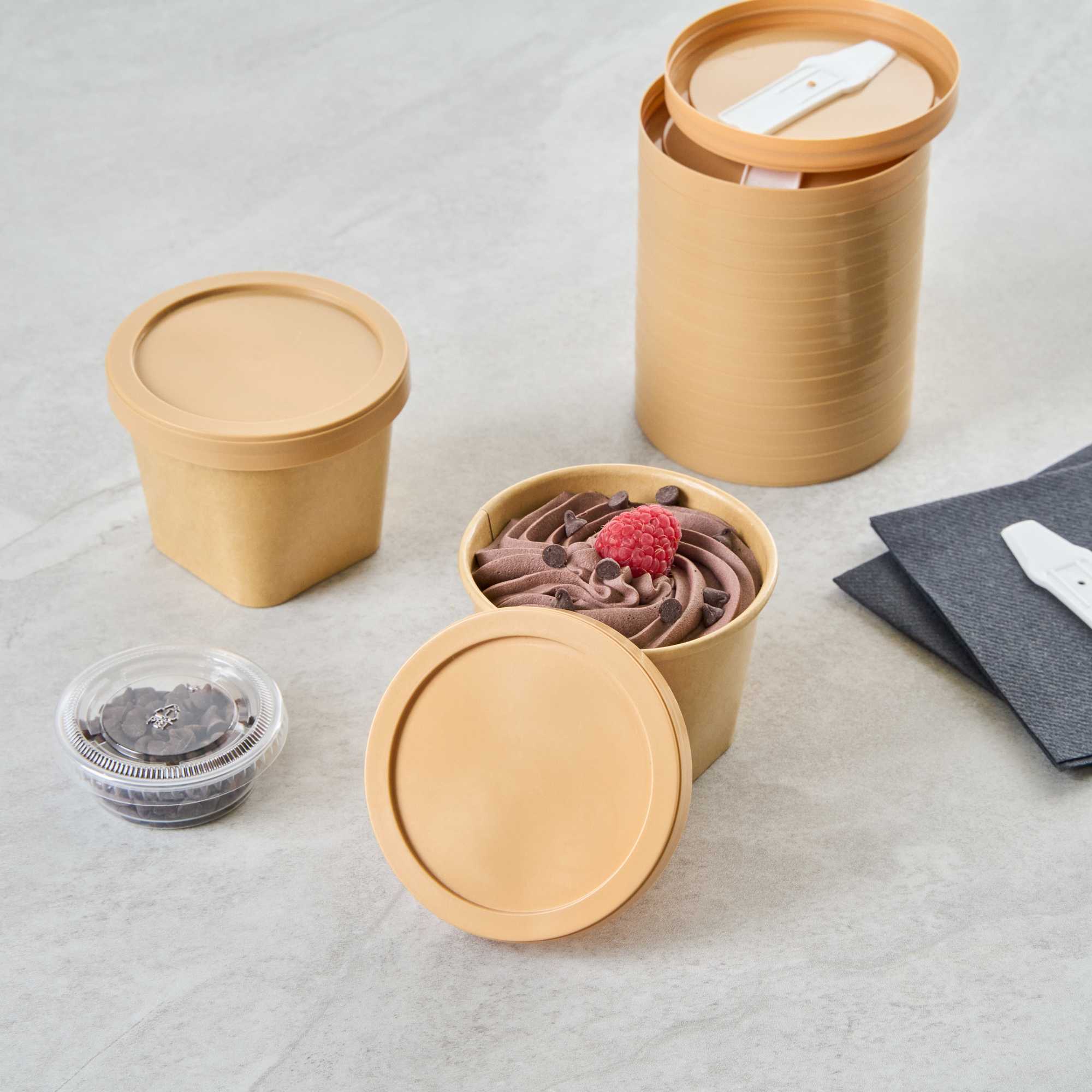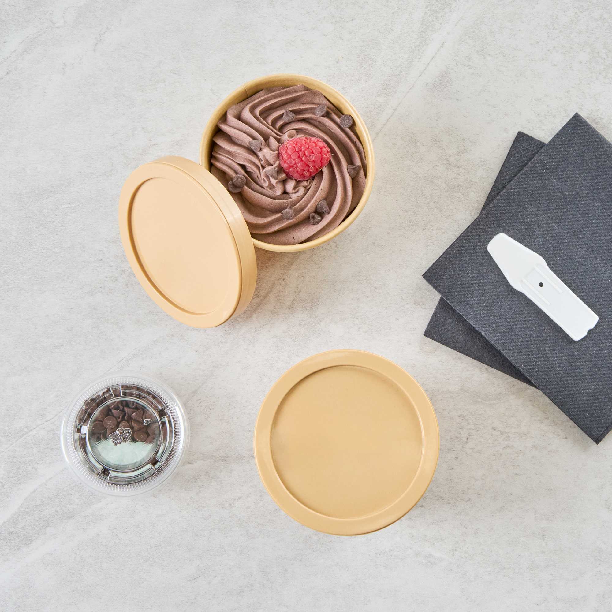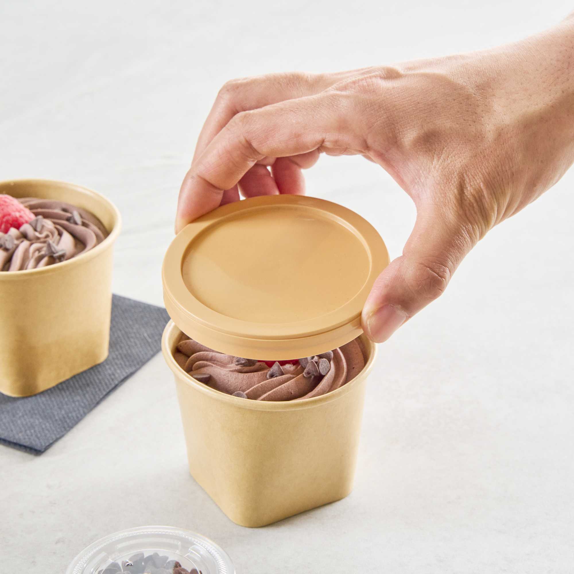 Enhance your takeout packaging with our Coppetta Round Brown Plastic Lids. These disposable lids are made from durable plastic to ensure reliable use for various food items. Coordinate these plastic lids with our 6 and 13-ounce Coppetta cups to securely hold ice creams and treats. Featuring a recyclable design, these brown plastic lids help reduce your restaurant's environmental impact. Including a convenient plastic spoon, these lids make it easy for customers to enjoy treats on the go. The versatile design of these to go cup lids allows for serving both hot and cold items with ease. With a natural brown finish, these ice cream cup lids add a stylish and eco-friendly look to your restaurantware. Each of these plastic lids measures 3.39 inches in length by 3.39 inches in width by 0.51 inches in height, providing a perfect fit for your cups. Sold in a 50 count box.