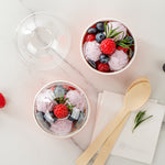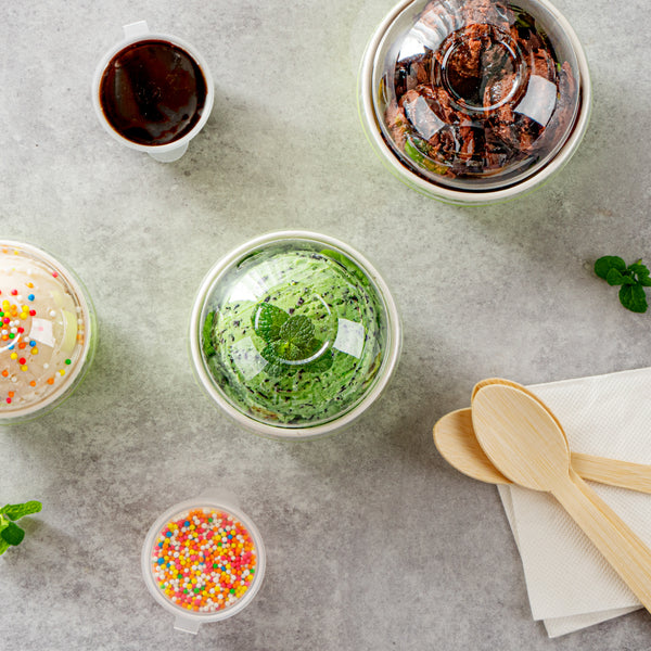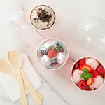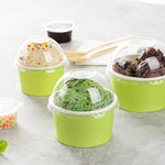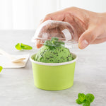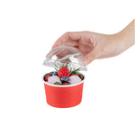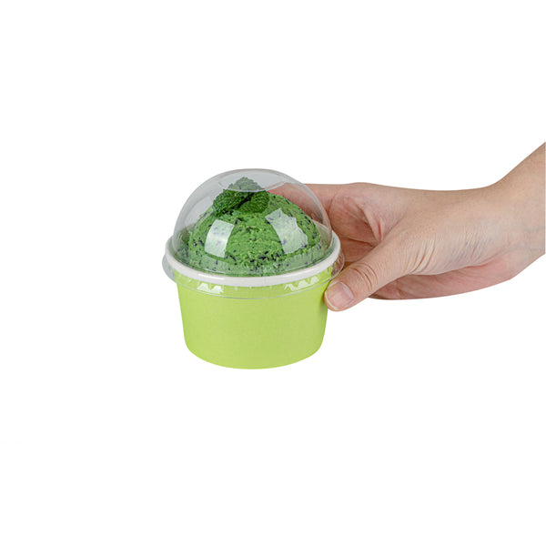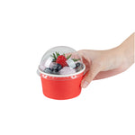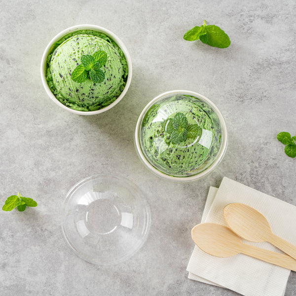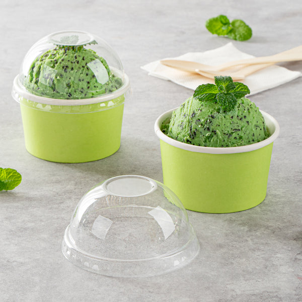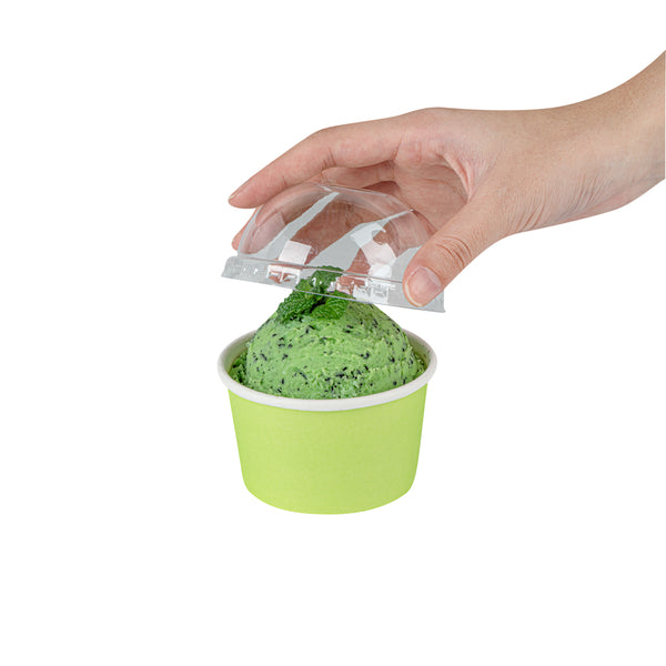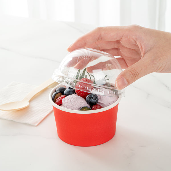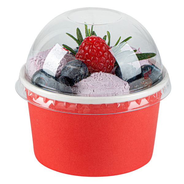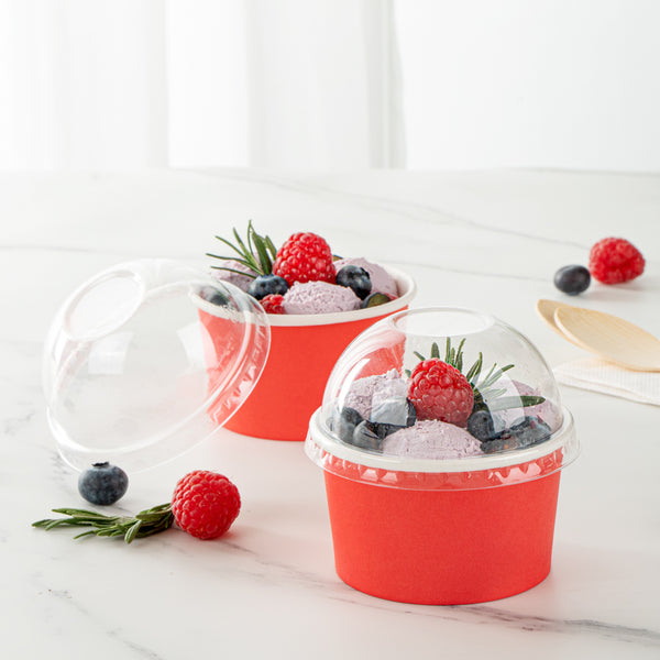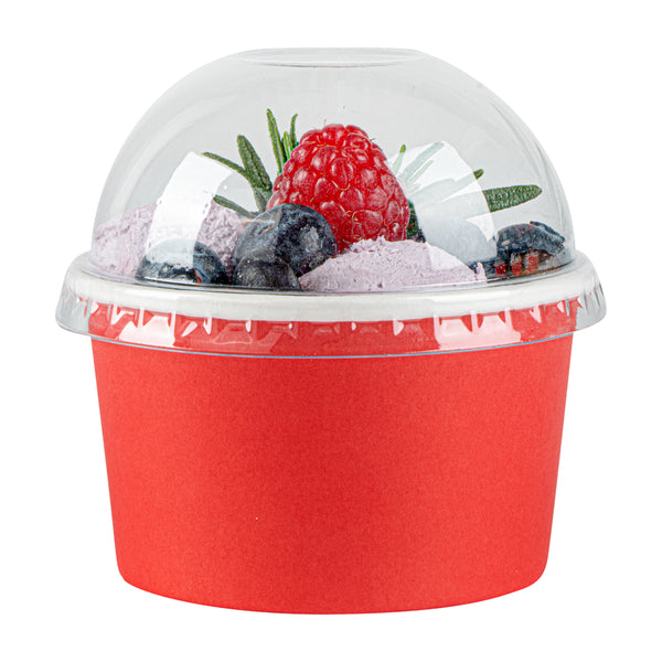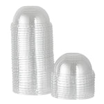 Provide an irresistible sneak peek into your delicious desserts with the Coppetta Round Clear Plastic To Go Cup Dome Lids. Made from premium plastic, these dome-shaped lids create an airtight seal to prevent messy spills. Pair these plastic lids with our 5-ounce Coppetta Round Paper To Go Cups to make them conveniently portable. The crystal clear finish of these snap-on lids enables customers to get a tempting glimpse of the sweet treats inside. The raised dome design gives plenty of headroom for customers to pile on crushed candies, whipped cream, and other mouthwatering toppings. These transparent lids are conveniently disposable yet recyclable. These lids for round dessert cups have a diameter of 3.25 inches by a height of 1.5 inches to fit our 5-ounce Coppetta To Go Cups. Sold in a 50 count box. Dessert cups are available and sold separately.