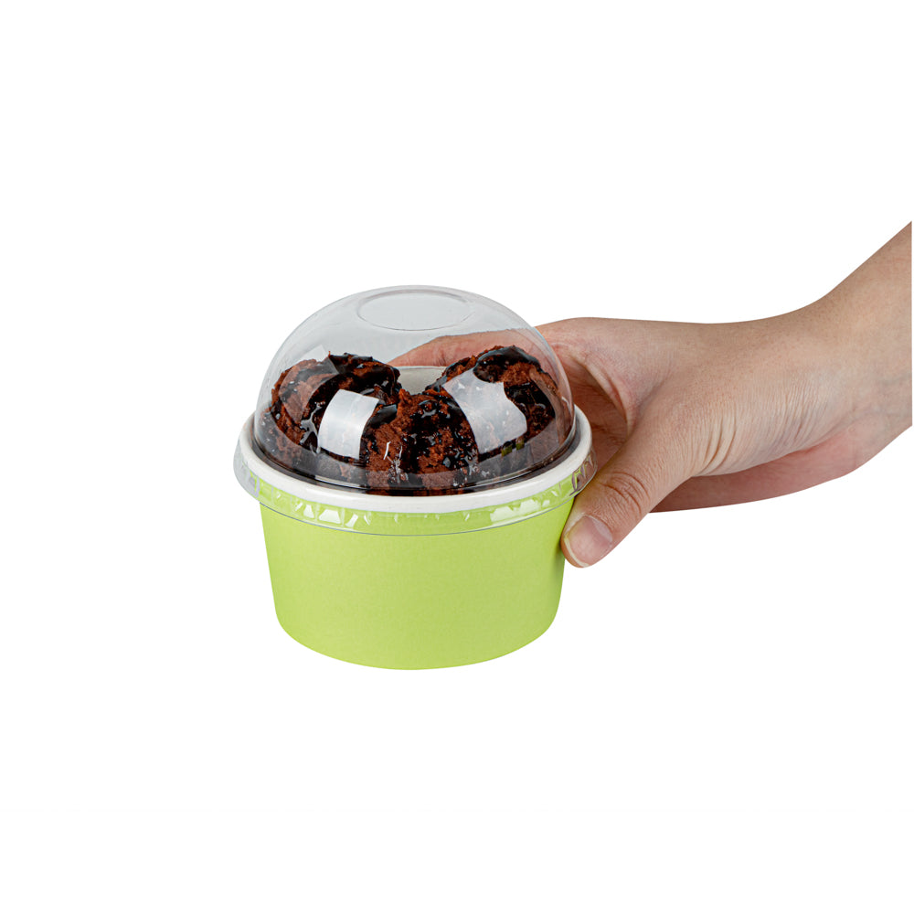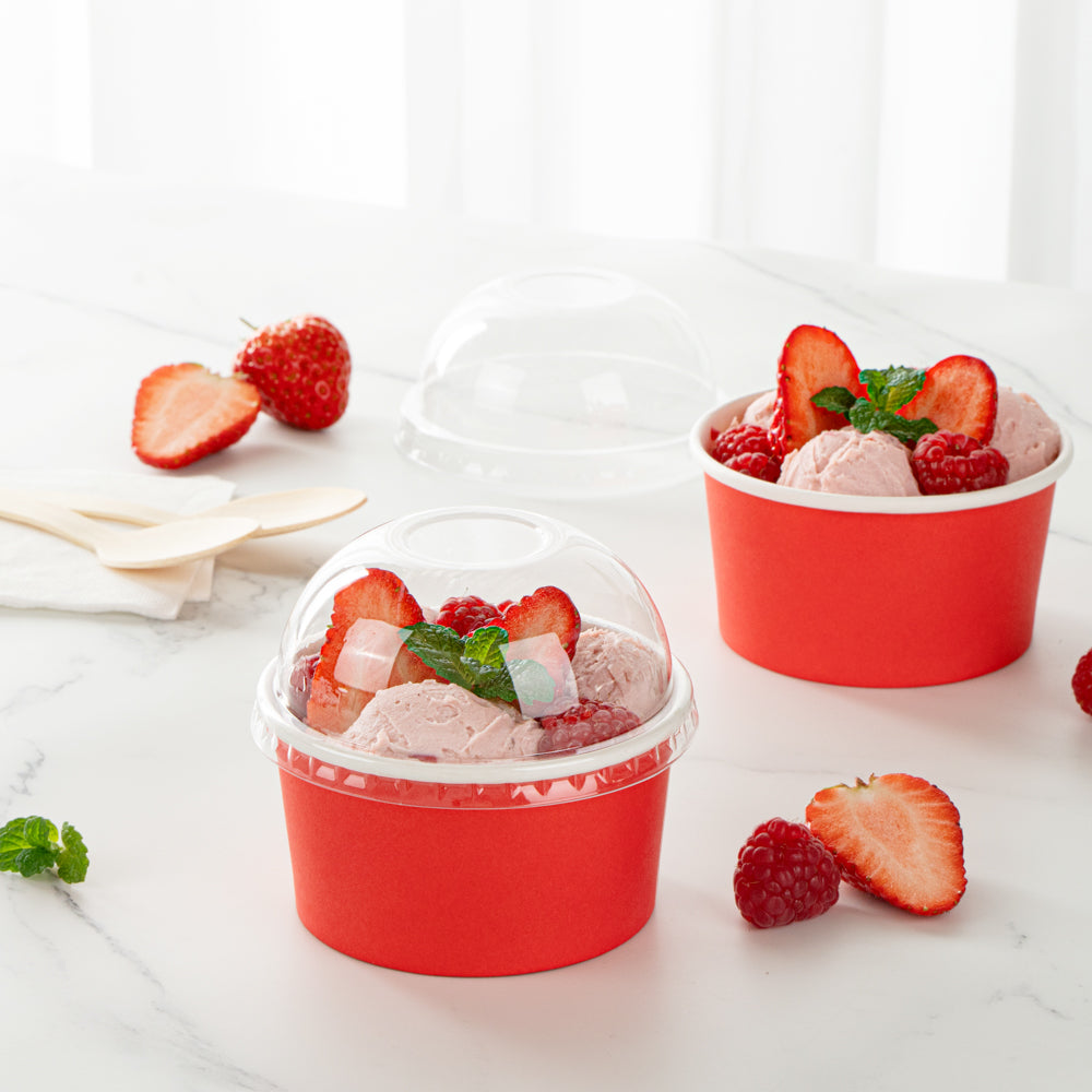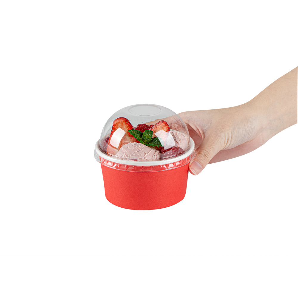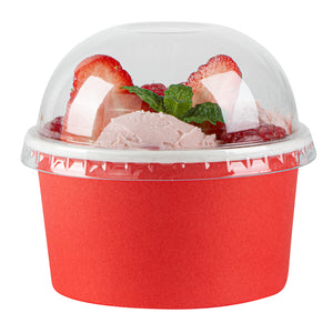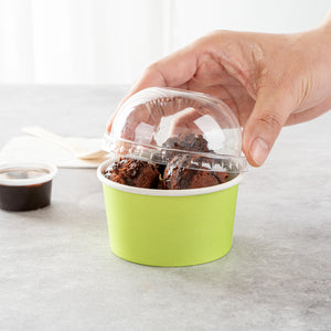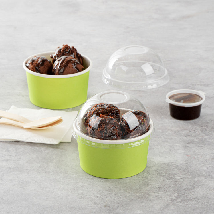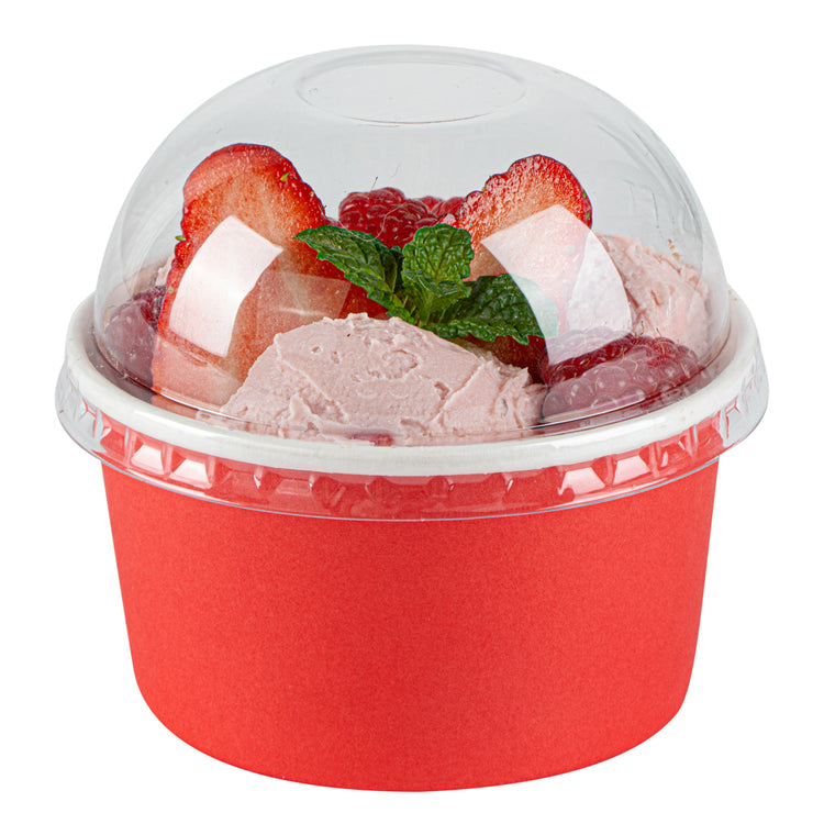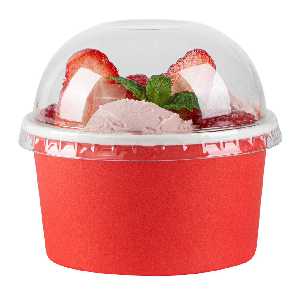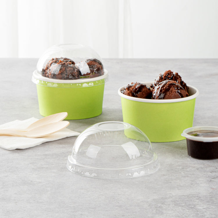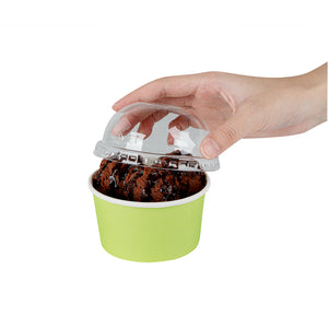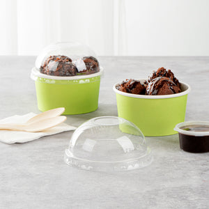 Provide a convenient way to transport treats with our Coppetta Round Clear Plastic To Go Cup Dome Lids. Made from premium plastic, these recyclable dome lids are sturdy and do not break easily. To securely seal in freshness, these clear plastic lids snap firmly onto our Coppetta 8-ounce Paper To Go Cups. With a dome shape, these disposable lids allow maximum visibility of contents. To prevent spills during transport, these plastic cup lids have an airtight seal. For easy access, these transparent lids easily snap on the coordinating cups. To match any decor, these plastic dessert cup lids have a crystal clear finish. Measuring 3.75 inches in diameter by 1.75 inches in height, these plastic to go cup lids are compact for space-efficient storage. Sold in a 200 count box. Dessert cups are available and sold separately.