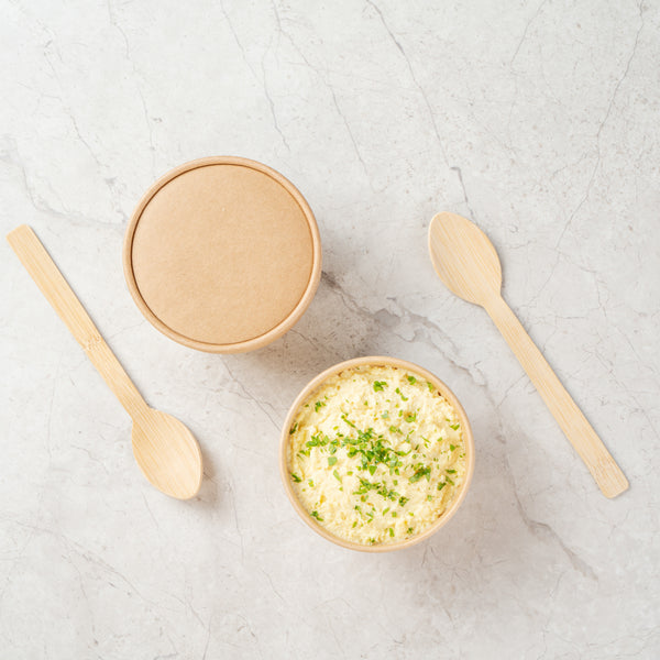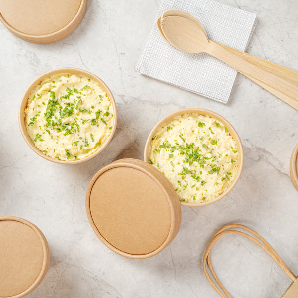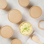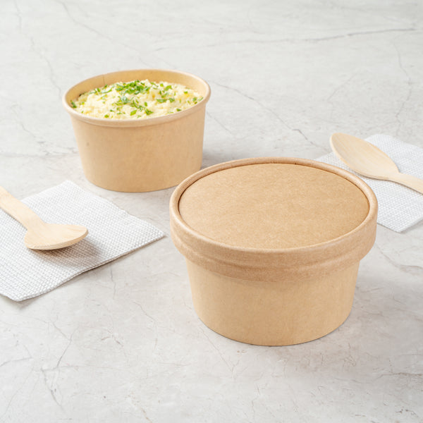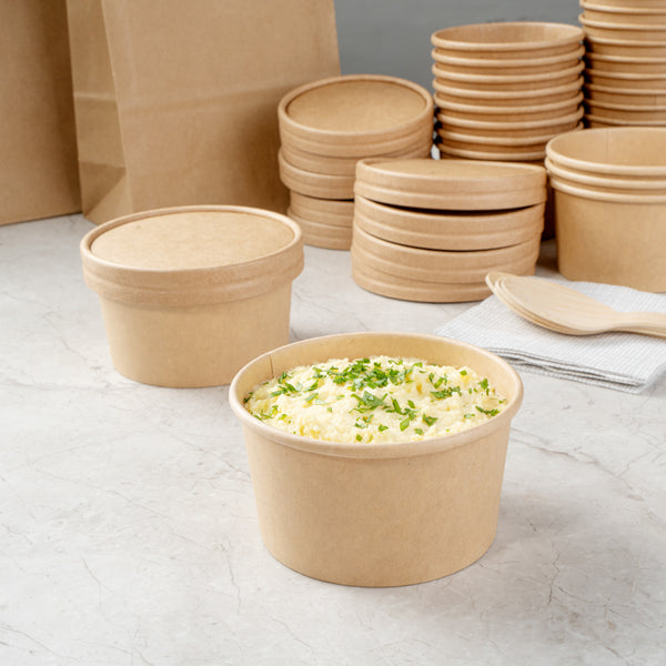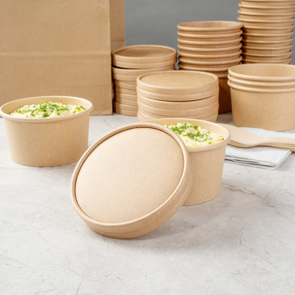 All of the deli container lids are available in kraft or white finishes so you can match them with our colorful cups. Plus, they seamlessly blend with your event's decor.
