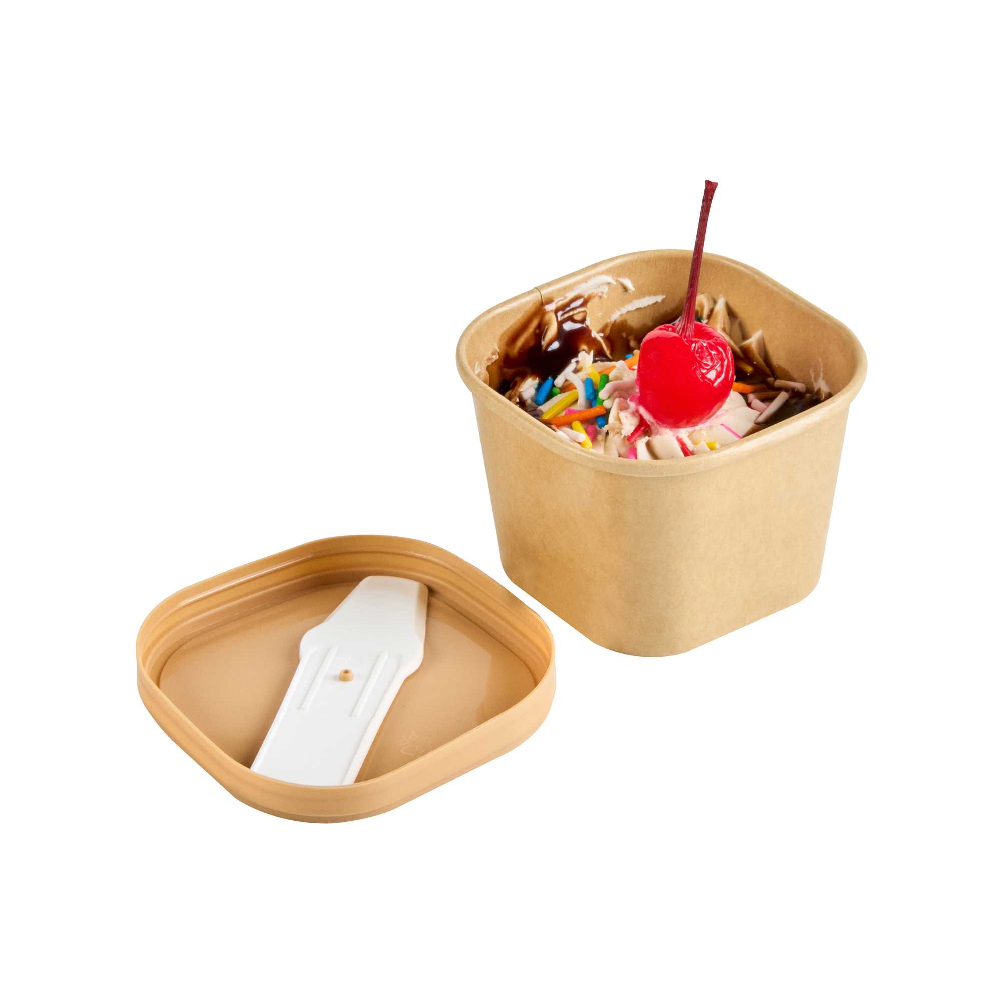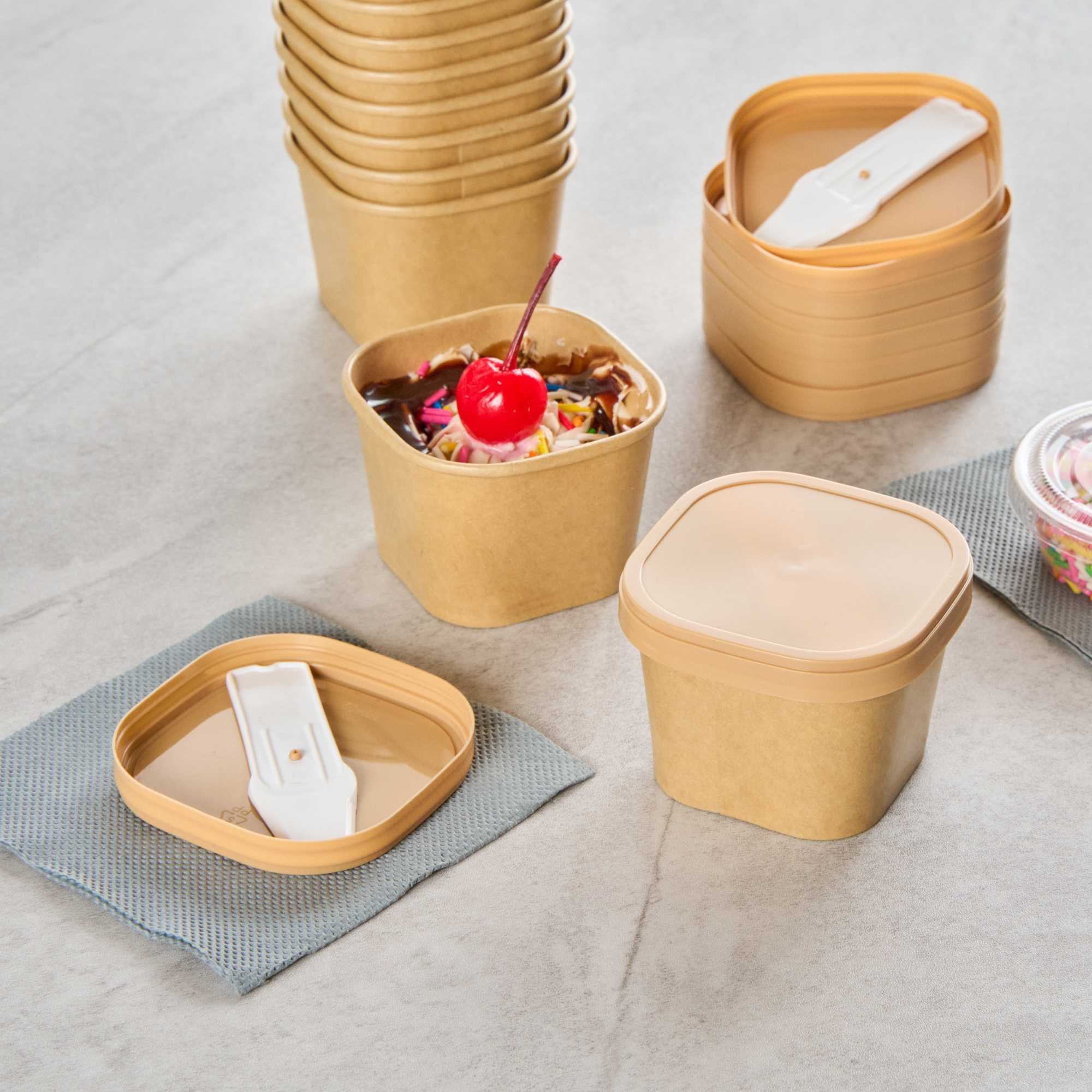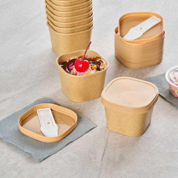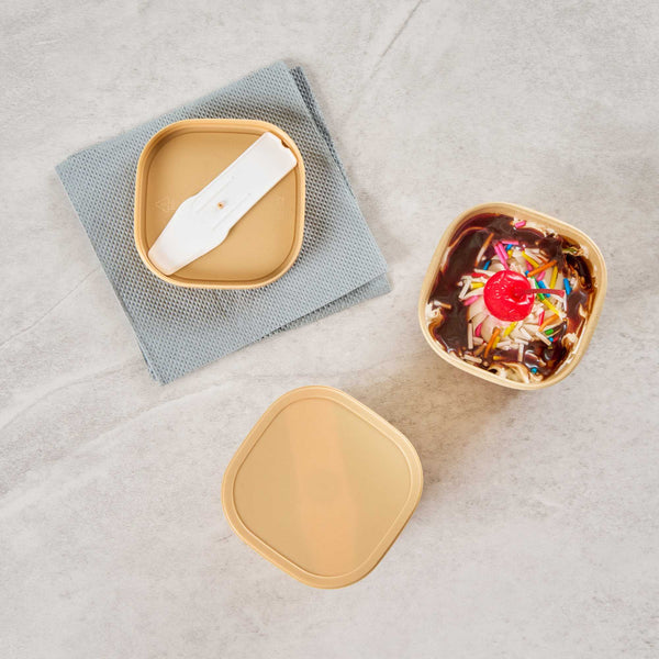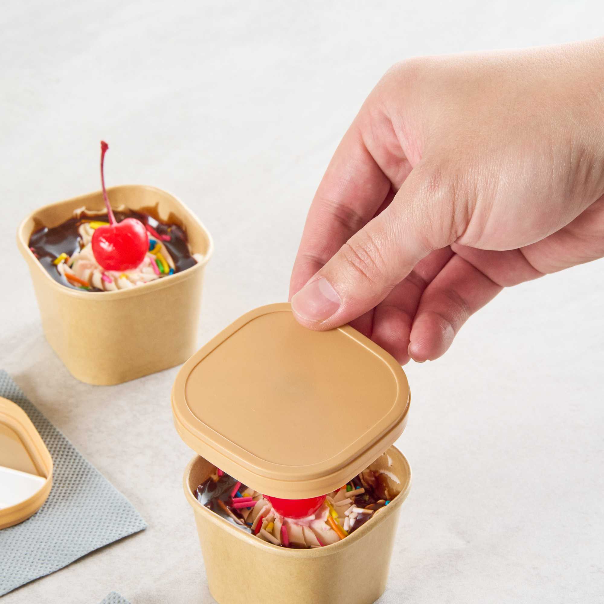 Enhance your foodservice presentation with our Coppetta Square Brown Plastic Lids. These durable plastic lids ensure reliable use and are recyclable to reduce environmental impact, making them a sustainable choice for your restaurants. Coordinate these ice cream cup lids with our 3-ounce Coppetta cups to securely hold your ice creams and treats. Perfect for to-go orders, these disposable lids include a convenient plastic spoon for enjoying treats on the go. With a versatile design, these lids are suitable for both hot and cold treats, providing flexibility for your menu offerings. The natural brown finish of these plastic lids adds a stylish touch to your take-out packaging. Measuring 2.44 inches in length by 1.77 inches in width by 0.35 inches in height, these brown plastic lids fit securely to prevent spills. Sold in a 50 count box.
