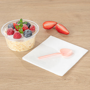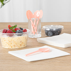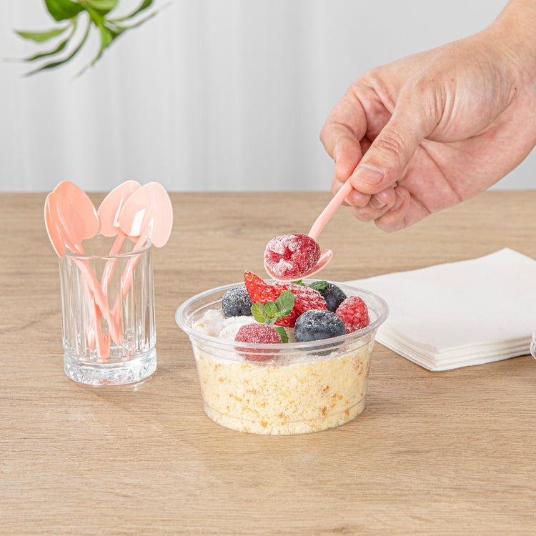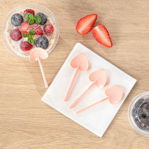 Add a touch of love and charm to your desserts with our Coppetta Coral Plastic Love Shovel Spoons. Featuring a trendy coral pink finish, these frozen yogurt spoons are ideal for popular ice cream parlors and artisanal gelaterias. The heart-shaped shovel head of these heart shovel spoons effortlessly scoops up ice creams. With their sturdy plastic handle, these recyclable dessert spoons are built to stay strong against big scoops of ice cream and hefty spoonfuls of gelato. These coral ice cream spoons are disposable for easy cleaning. Measuring 3.5 inches long by 1.25 inches wide, you can use these heart-shaped spoons as stylish mini-tasting spoons or serve alongside your delectable desserts or miniature appetizers. Sold in a 100 count box.