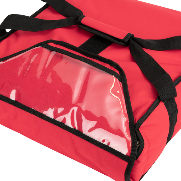 Keep pizzas hot during delivery with our Delivery Tek Red Pizza Bag. This pizza delivery bag can hold two 16-inch pizza boxes or three 14-inch pizza boxes. Designed with a 1.5-inch thick PET insulation, this pizza hot bag keeps your pies warm for a long time. With an interior polyester lining, this commercial pizza delivery bag can simply be wiped down in between uses. Featuring an extra-large flap that provides a tight seal, these pizza bags ensure your boxes won't fall out during transport. Equipped with a carrying handle, this insulated pizza bag provides an ergonomic grip for comfortably transporting your special deliveries. The clear ID window of this pizza-carrying bag allows you to store menus, receipts, coupons, or advertisements conveniently. With heavy-duty stitching, this red pizza bag is durable, making it perfect for repeated use. To effortlessly clean after use, this insulated pizza carrier bag is machine washable. This hot pizza delivery bag measures 16.5 inches long by 18 inches wide by 6.5 inches tall. Sold in a 1 count box.