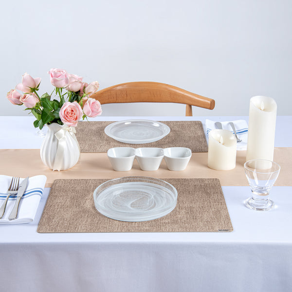 - Linen-feel design adds sophistication to tablescapes