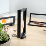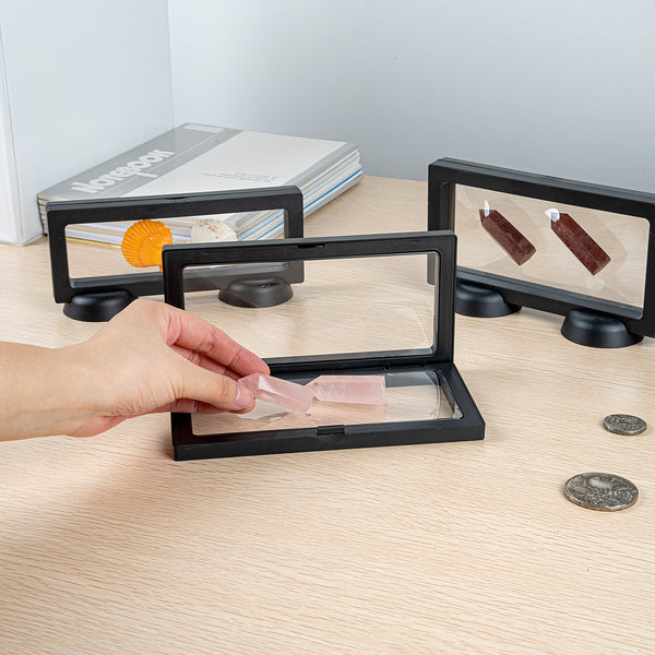 Highlight your collectibles in our Display Tek Rectangle Black Plastic 3D Floating Display Cases. These rectangle display cases are made of premium ABS plastic, ensuring durability. The eye-catching 3D floating design of these black display cases captivates onlookers, and the clear film allows for a panoramic view of your items. Protecting your treasure from scratches, dust, and fingerprint smudges, these plastic display cases ensure your valuables remain pristine. Designed with a push-to-open latch, these plastic exhibit boxes offer secure and easy access to your displayed items. Pair our display stand with these floating display cases to create an appealing presentation. These clear plastic display cases measure 7 inches in length by 3.5 inches in width, skillfully utilizing space for safeguarding your prized possessions. Sold in a 10 count box. Display case stands are available and sold separately.