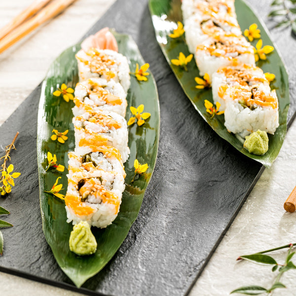 Create an exotic-inspired presentation for your dishes with our Dojo Green Fresh Bamboo Leaves. These vibrant bamboo leaves for sushi rolls add flair to your food presentation. Packaged in an innovative vacuum-sealed bag, these fresh bamboo leaves are able to expertly maintain their freshness until you're ready to use them. After opening a vacuum-sealed pack, we recommend refrigerating these food-safe bamboo leaves in water and using them within 2-3 days. Measuring around 11.75 inches in length by 3.5 inches in width, these fresh bamboo leaves are ideal for plating appetizers, tapas, entrees, and desserts. Shipped in a 1,000 count box. These bamboo leaves are not intended for consumption.