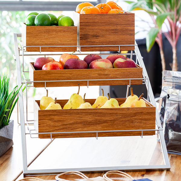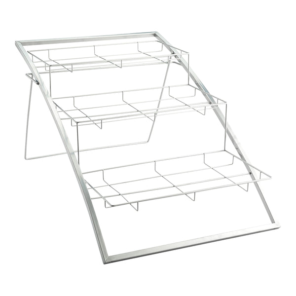 Display your coffee shop's popular items using our Eco Display Iron Condiment Rack Frames. This 3 tier stand is crafted from durable iron with a silver finish and is designed to be decorative storage for your coffee shop, bakery, or other foodservice establishments. Constructed with layered shelves and a thick wire design, this large metal rack is angled for easy visibility and access to items. This metal stand with shelves is freestanding and strong, so it won't tip over under the weight of your baked goods or kitchen utensils. Pair this large metal rack with our coordinating Eco Display Bamboo Boxes to simplify your multipurpose storage. Measuring 25.25 inches long and 10.5 inches wide and 13.5 inches tall, this 3 tier metal rack is sold in a 1 count box. Bamboo boxes are available and sold separately.