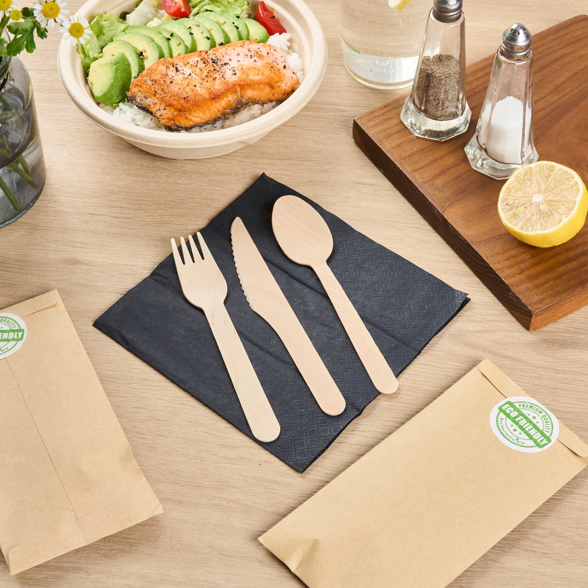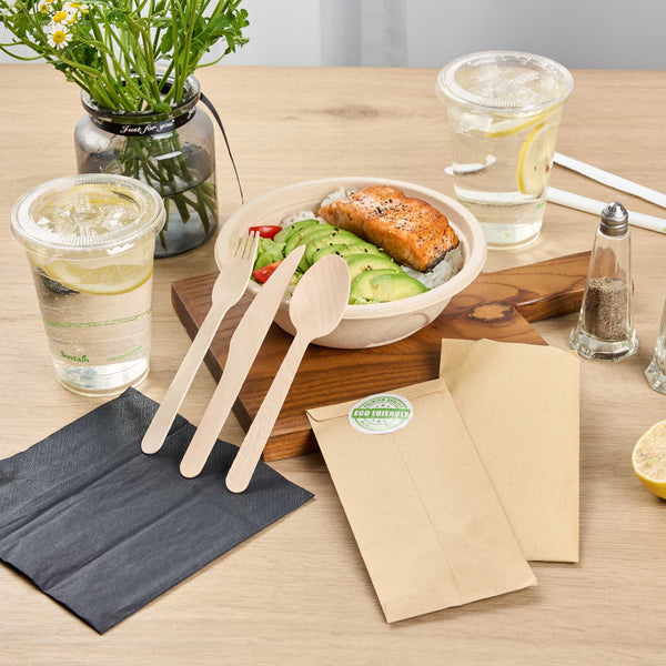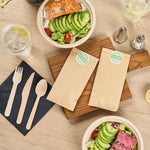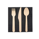 NATURAL WOOD CUTLERY SET - WITH BLACK NAPKIN AND PAPER POUCH