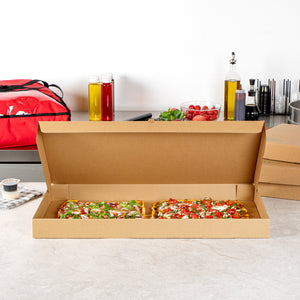 Present delicious flatbreads, pizzas, or tortillas in a simple and clean way by using our Kraft and Green Paper Corrugated Flatbread Boxes. Made from E-flute corrugated cardboard, these rectangle pizza boxes have an innate ability to keep pizza warm and insulated for some time. These flatbread to-go boxes can be securely closed with the tab-lock slot, which keeps the content in shape until delivered. Designed to hold flatbreads and more, these boxes are sturdy and durable, preventing them from getting torn during transit. Featuring a kraft and green finish with an eye-catching look, these corrugated flatbread boxes give a fun twist to your takeout orders. With a grease-resistant construction, these flat pizza boxes allow you to go generous on sauces and toppings without letting them mess up or seep out. These one-piece corrugated cardboard pizza boxes can be folded and assembled effortlessly without the need for an adhesive. Measuring 24 inches in length by 8 inches in width by 2 inches in height, these compact flatbread boxes are ideal for any pizza store, cafe, or restaurant to deliver fresh food. Shipped in a 50 count box.