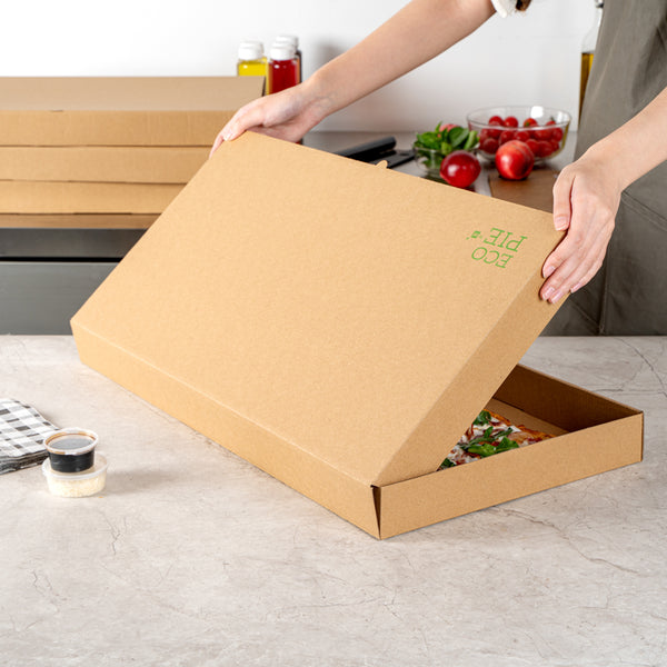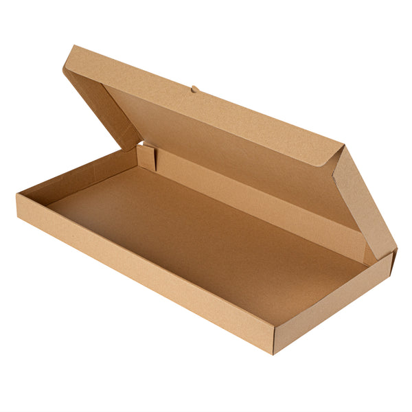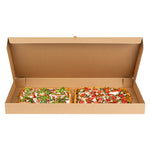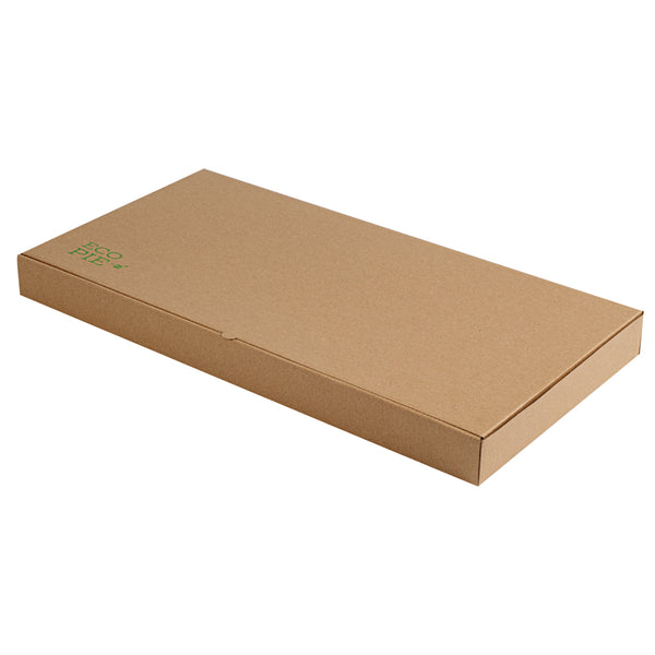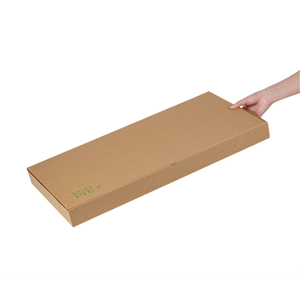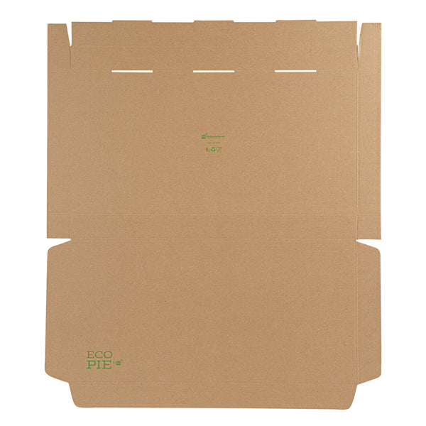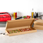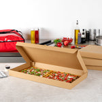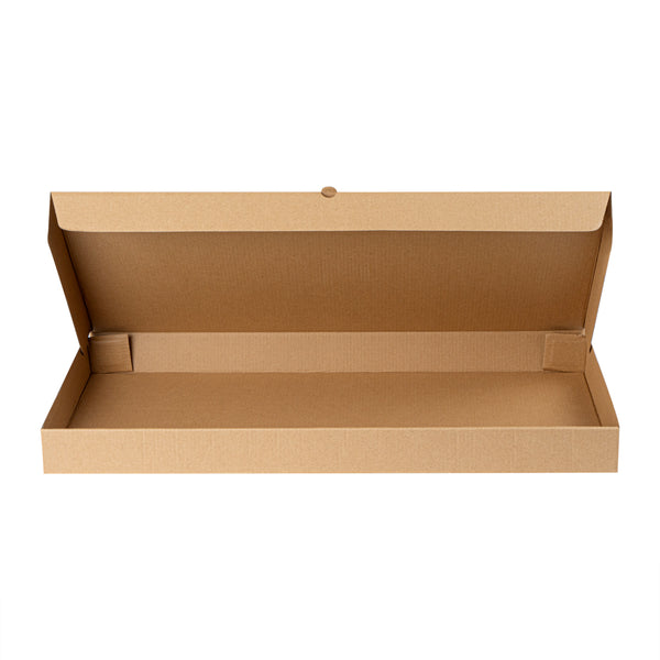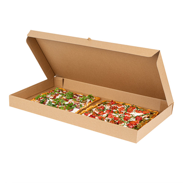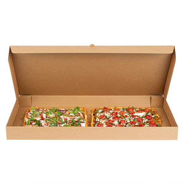 Present delicious flatbreads, pizzas, or tortillas in a simple and clean way by using our Kraft and Green Paper Corrugated Flatbread Boxes. Made from E-flute corrugated cardboard, these rectangle pizza boxes have an innate ability to keep pizza warm and insulated for some time. These flatbread to-go boxes can be securely closed with the tab-lock slot, which keeps the content in shape until delivered. Designed to hold flatbreads and more, these boxes are sturdy and durable, preventing them from getting torn during transit. Featuring a kraft and green finish with an eye-catching look, these corrugated flatbread boxes give a fun twist to your takeout orders. With a grease-resistant construction, these flat pizza boxes allow you to go generous on sauces and toppings without letting them mess up or seep out. These one-piece corrugated cardboard pizza boxes can be folded and assembled effortlessly without the need for an adhesive. Measuring 24 inches in length by 8 inches in width by 2 inches in height, these compact flatbread boxes are ideal for any pizza store, cafe, or restaurant to deliver fresh food. Shipped in a 50 count box.