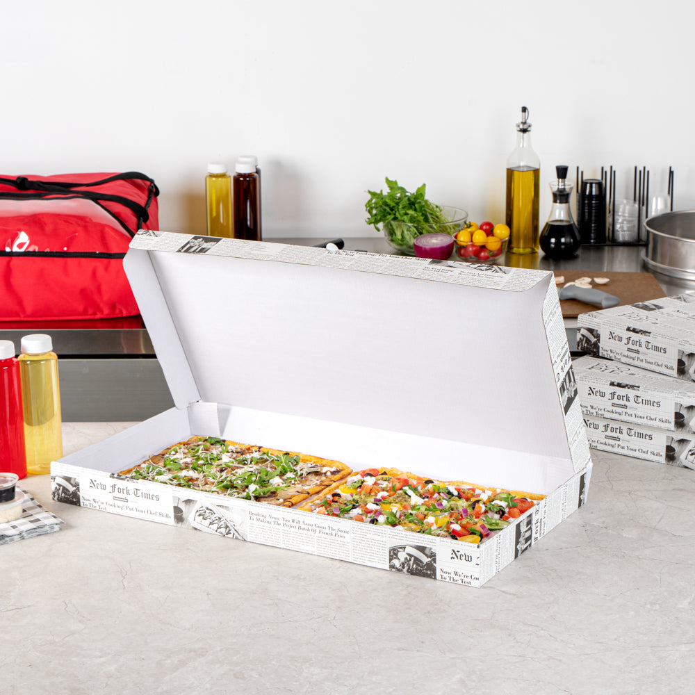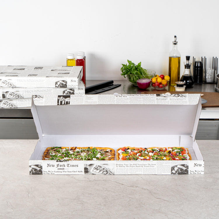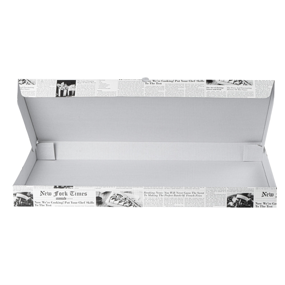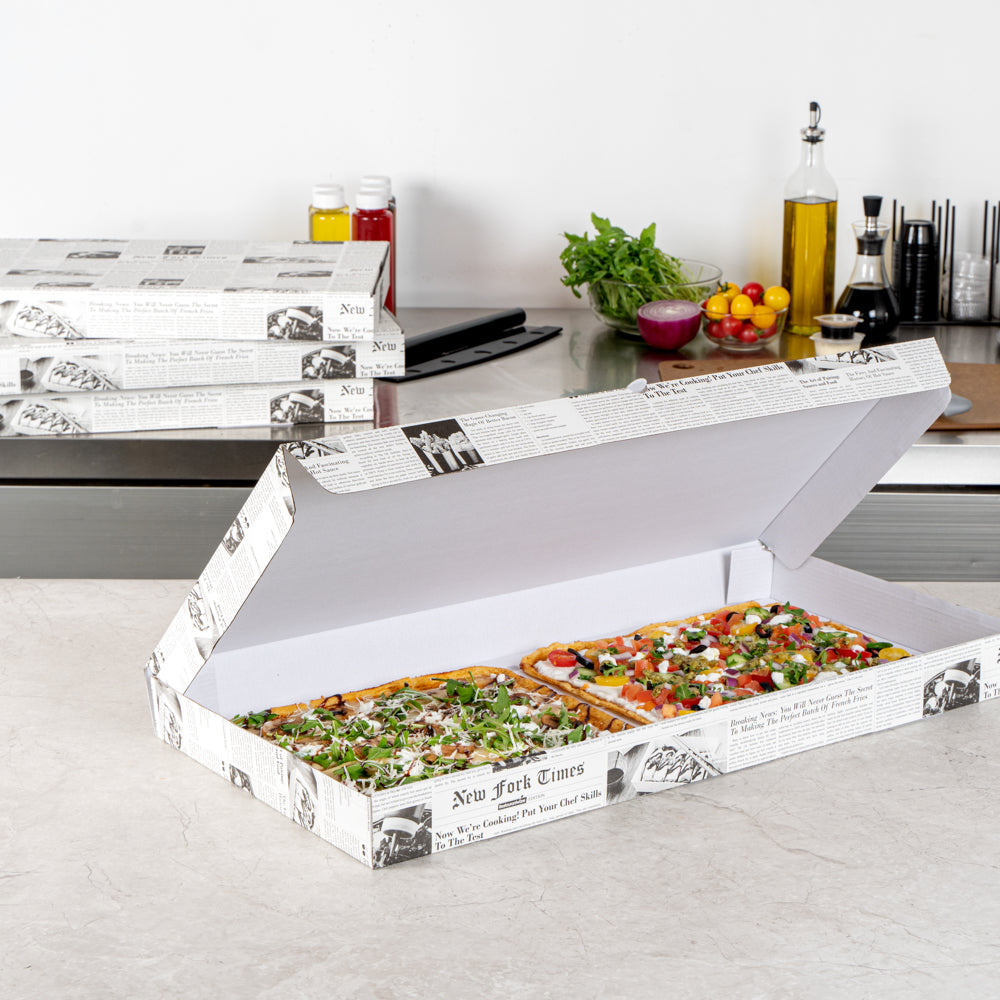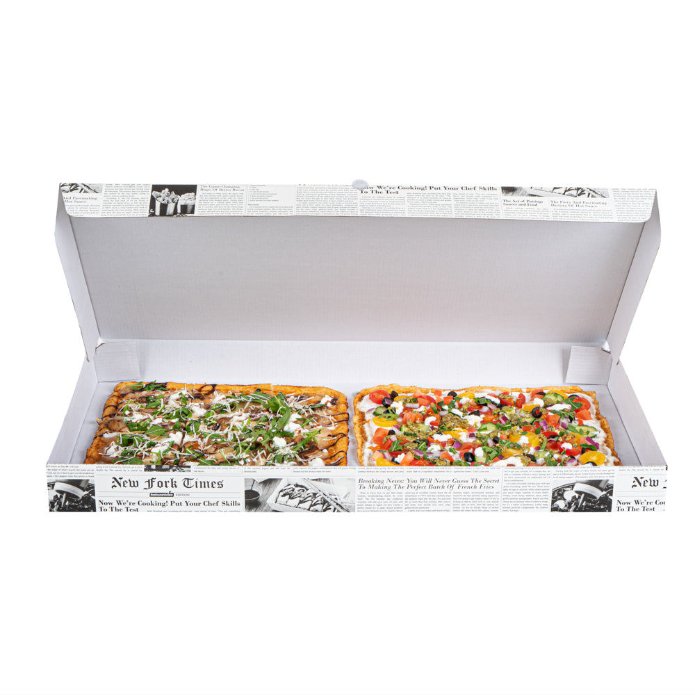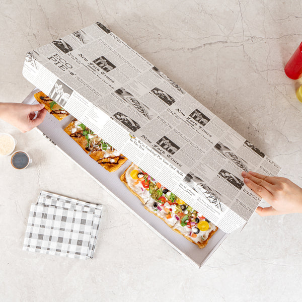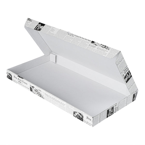 Present a newsworthy touch to your standard delivery boxes by using our Newsprint and White Paper Corrugated Flatbread Boxes. With a durable build, these flatbread boxes are sturdy and can't be torn off easily. These corrugated flatbread boxes keep the contents fresh and warm until they are delivered. The dissipation vents of these flat pizza boxes allow the extra moisture to escape, avoiding the contents from getting soggy. These flatbread to-go boxes come with a tab-lock slot for conveniently securing the contents from falling out during delivery. Featuring a newsprint design, these white corrugated pizza boxes are ideal for delivery orders at food trucks, pizzerias, cafes, or restaurants. Plus, these rectangle pizza boxes can be assembled in a minute with no techniques involved before serving. Measuring 24 inches in length by 8 inches in width by 2 inches in height, these white corrugated pizza boxes are great for packing tortillas, sicilian pizzas, or pies. Shipped in a 50 count box.