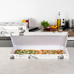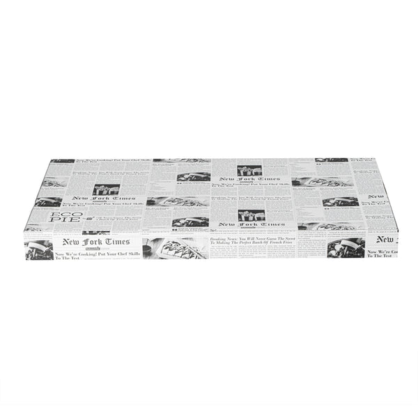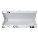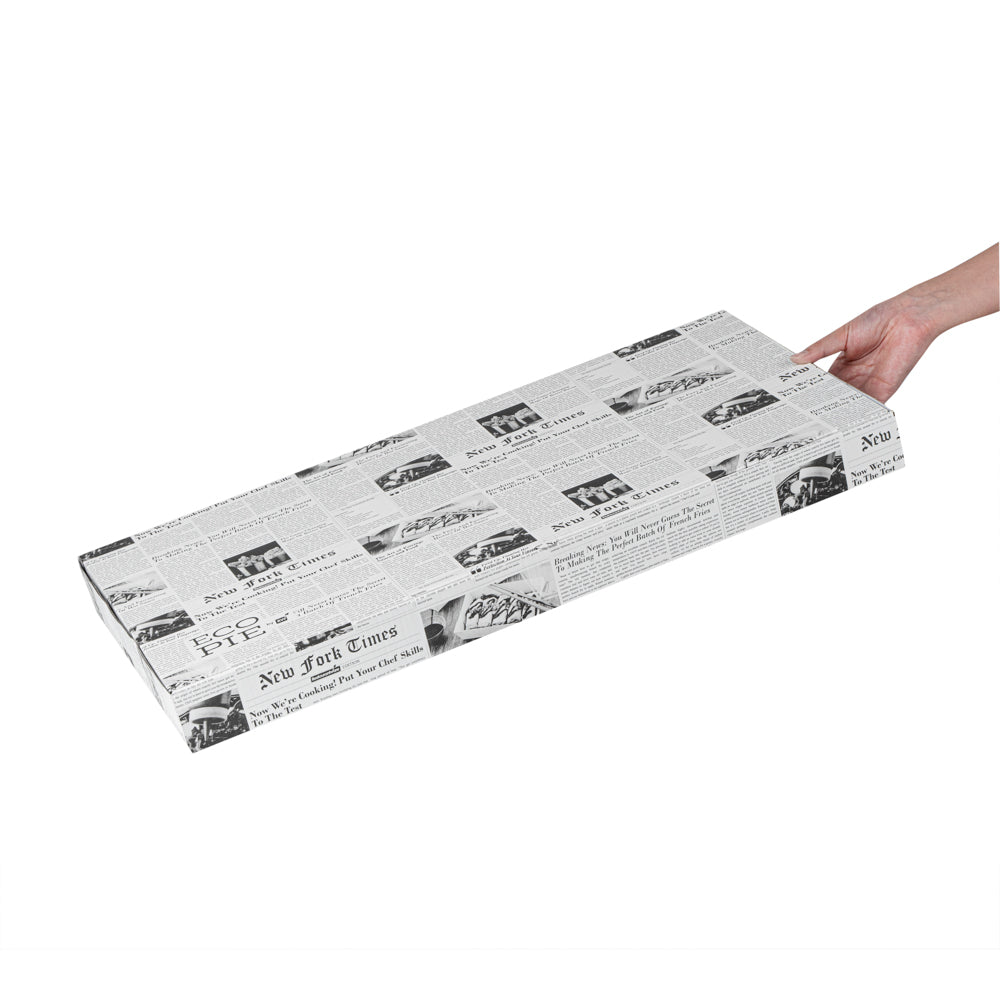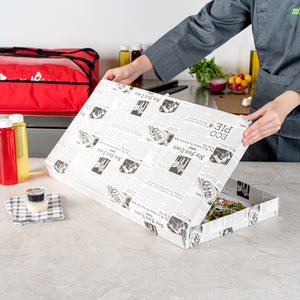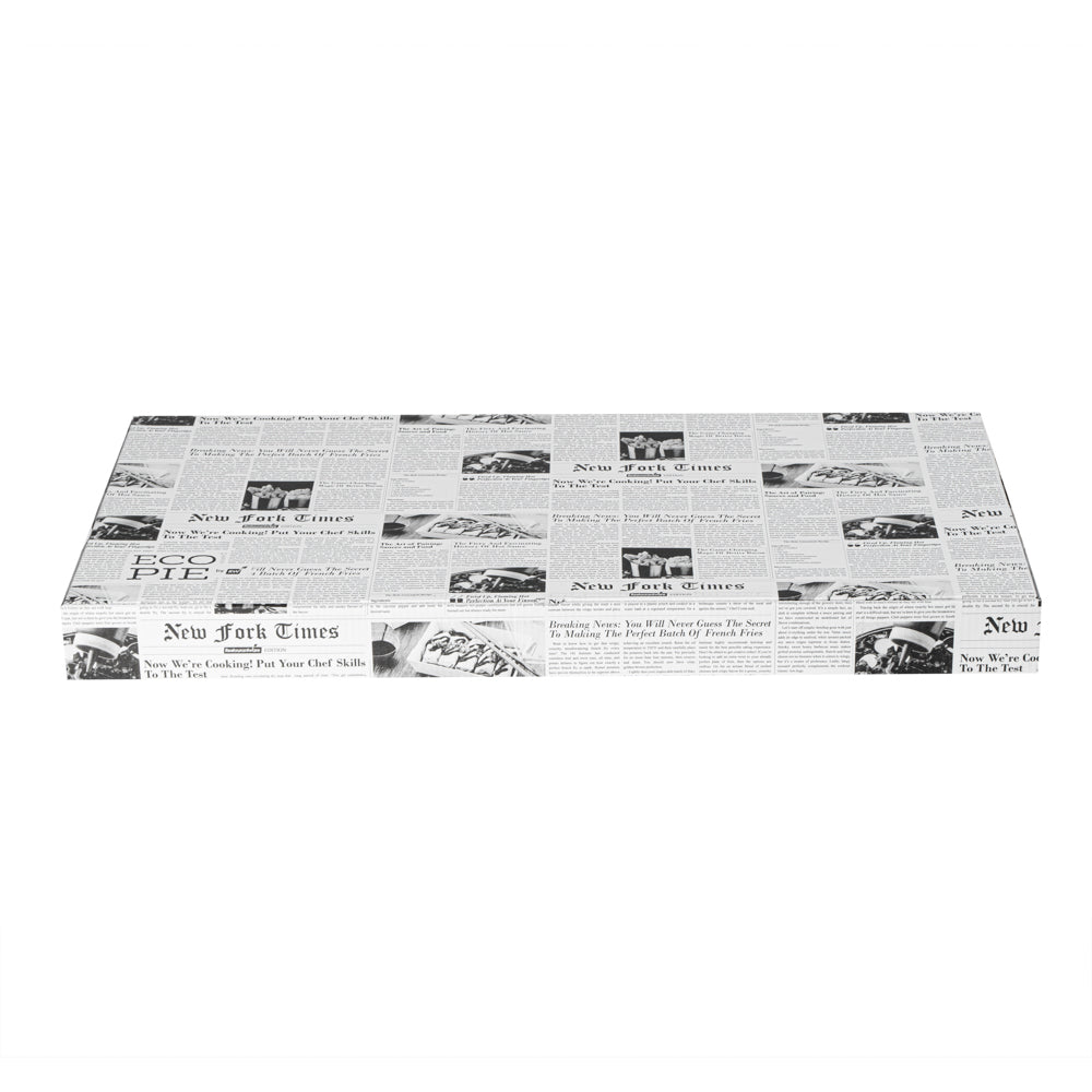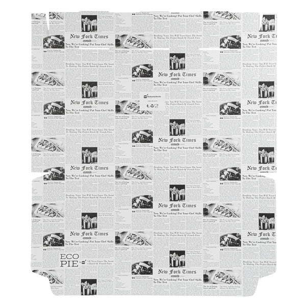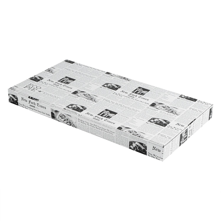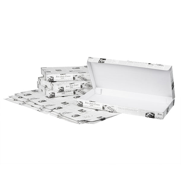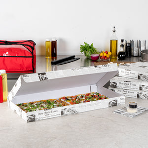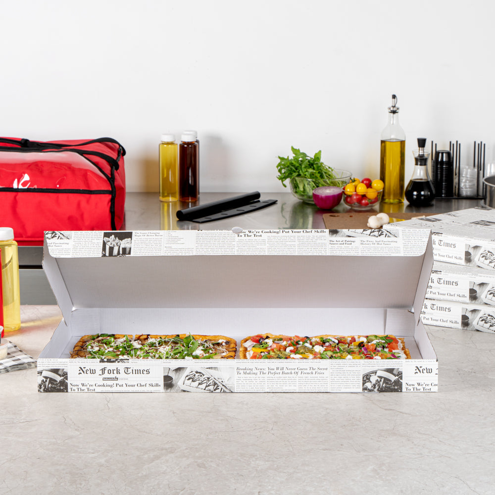 Present a newsworthy touch to your standard delivery boxes by using our Newsprint and White Paper Corrugated Flatbread Boxes. With a durable build, these flatbread boxes are sturdy and can't be torn off easily. These corrugated flatbread boxes keep the contents fresh and warm until they are delivered. The dissipation vents of these flat pizza boxes allow the extra moisture to escape, avoiding the contents from getting soggy. These flatbread to-go boxes come with a tab-lock slot for conveniently securing the contents from falling out during delivery. Featuring a newsprint design, these white corrugated pizza boxes are ideal for delivery orders at food trucks, pizzerias, cafes, or restaurants. Plus, these rectangle pizza boxes can be assembled in a minute with no techniques involved before serving. Measuring 24 inches in length by 8 inches in width by 2 inches in height, these white corrugated pizza boxes are great for packing tortillas, sicilian pizzas, or pies. Shipped in a 50 count box.