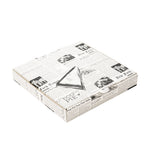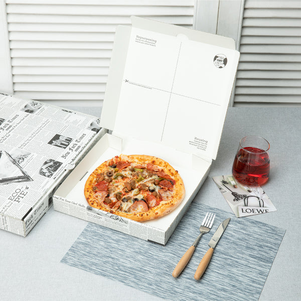 Pack up cheesy pizzas for delivery using our Eco Pie Newsprint Paper Corrugated Pizza Boxes. Made from premium corrugated paper, these sturdy pizza boxes are great for holding hefty deep dish pies or thin crust pizzas. Designed to eliminate the need for disposable plates, these printed pizza boxes can be repurposed into 4 individual plates. Customers can simply cut across the dotted lines on the lid to instantly turn these pizza boxes into plates. Great for avoiding soggy messes, these printed pizza boxes are greaseproof. These disposable pizza boxes are conveniently recyclable, to provide customers with an earth-friendly way to dispose of containers after use. With a classic newsprint design, these pizza boxes add a modern touch to your take out supplies. Ideal for reheating leftover slices of pizza, these printed pizza boxes are microwave-safe. Measuring 14.5 inches in length by 1.75 inches in width, these disposable pizza boxes perfectly fit large pizzas. Shipped flat for space-saving storage, these printed pizza boxes are easy to fold together and assemble. Sold in a 50 count box.