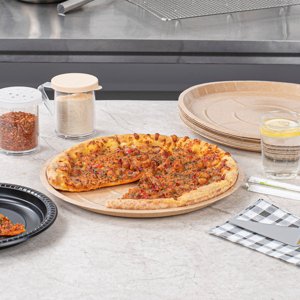 Elevate the serving experience of your delightful pizzas with our Eco Pie Round Kraft Paperboard Pizza Trays. Constructed from high-quality paperboard, these sturdy pizza trays ensure your orders are served without any messes. Devoid of added PFAs, these paper pizza trays prioritize the health-conscious choices for your customers. Perfect for baking and serving all-in-one tableware, these oven-safe trays offer versatility to meet the needs of your pizzeria. The greaseproof CPET coating of these disposable trays avoids any greasy residue, preserving a clean and polished service. Use these freezer-safe pizza trays to store your leftovers conveniently for future indulgence. Tailored for quick-service establishments and takeaways, these disposable trays simplify the cleanup process. The sophisticated kraft color and round shape of these kraft paper trays lend a rustic and visually appealing touch to your pizzas. Specifically designed for medium pizzas, these paper pizza pans measure 12 inches in diameter, providing an ideal canvas for displaying your pizza creations. Sold in a 25 count box.