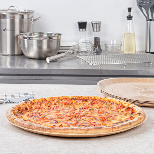 Present your mouth-watering pizzas with sophistication and ease using our Eco Pie Round Kraft Paperboard Pizza Trays. Crafted from durable paperboard, these sturdy pizza trays ensure a secure serving base for your pizzas. The microwavable feature of these kraft paper pizza trays adds convenience, preserving the warmth and flavor of your pizzas. Devoid of PFAs, these recyclable paper trays emphasize health-conscious choices for your customers. Ideal for baking, these oven-safe trays offer versatility to meet the demands of your pizzeria. The greaseproof CPET coating on these disposable pizza trays avoids greasy residue, maintaining a clean and professional service. Preserve your pizza leftovers conveniently for later relishing with these freezer-safe pizza trays. Tailored for quick foodservice establishments, these disposable trays simplify the cleanup process. The elegant kraft finish and round shape of these paper pizza pans introduce a rustic and visually appealing element to your orders. Specifically designed for large pizzas, these paper pizza pans measure 18 inches in diameter, offering an ideal canvas for showcasing your pizza creations. Sold in a 25 count box.