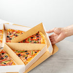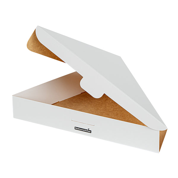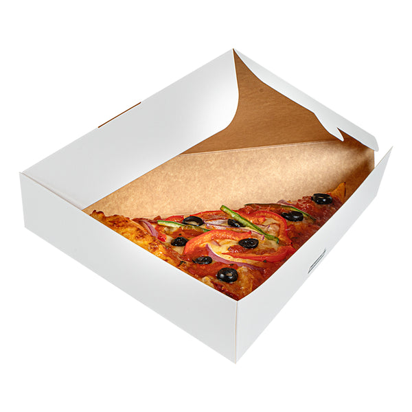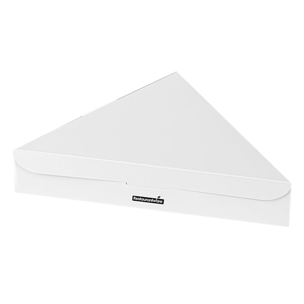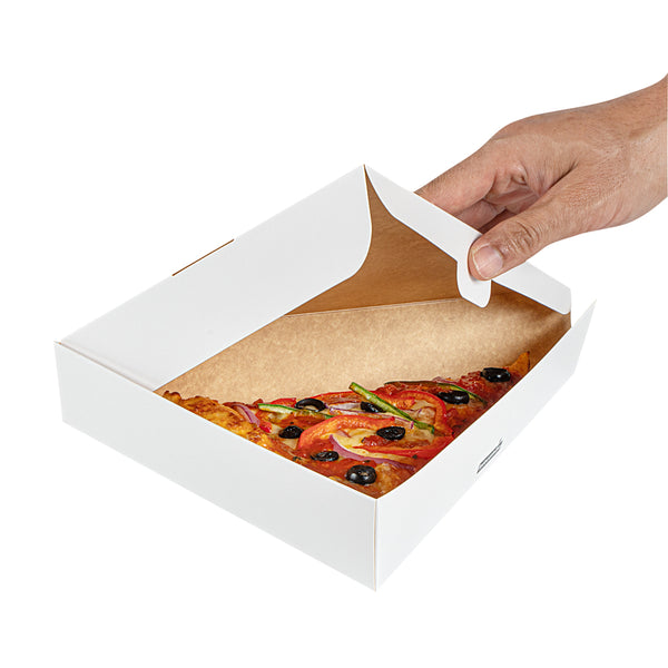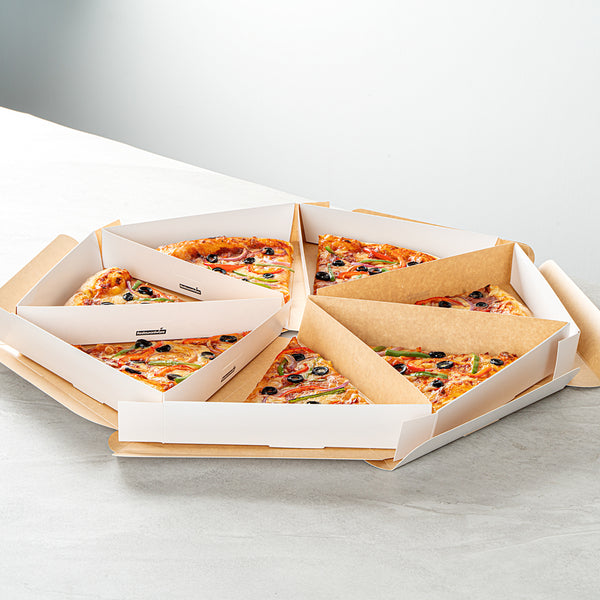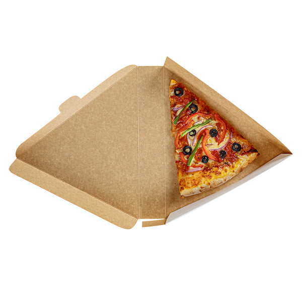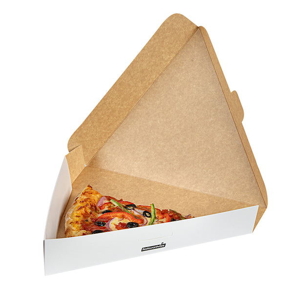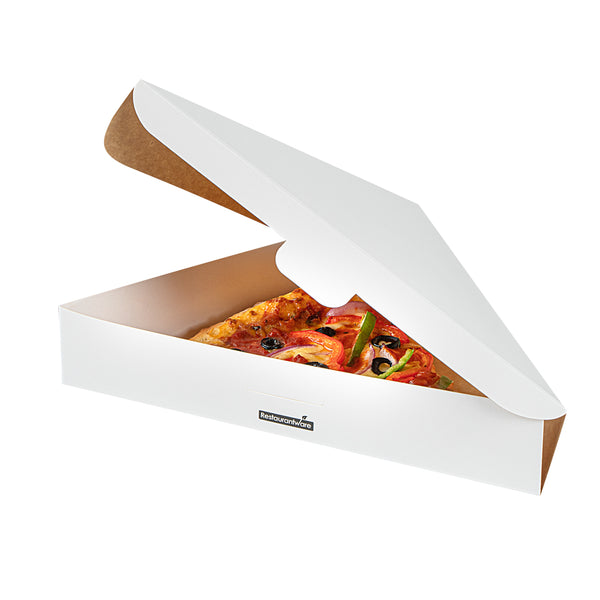 Ensure flawless delivery with our Eco Pie White Paper Pizza Slice Box. The White Greaseproof Pizza Slice Box features a clamshell design with a convenient tab lock, securing pizza slices during transit with ease. Crafted from durable paper, this clamshell pizza box maintains its structure under the weight of hot, fresh pizza, enhancing reliability for pizzerias and food trucks alike. The greaseproof PE lining expertly contains oils and sauces, preventing leaks that compromise cleanliness, making it ideal for busy takeout services. Its dimensions of 9.25 inches by 10.25 inches by 1.75 inches provide ample space for standard pizza slices, ensuring a snug fit without crumpling edges. Designed as a disposable pizza box, it streamlines operations by eliminating the need for washing, reducing overhead costs effectively. Choose this solution for an eco-friendly, recyclable option that meets modern sustainability standards. Each order includes 100 White Greaseproof Pizza Slice Boxes.
