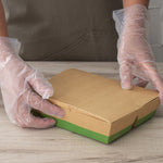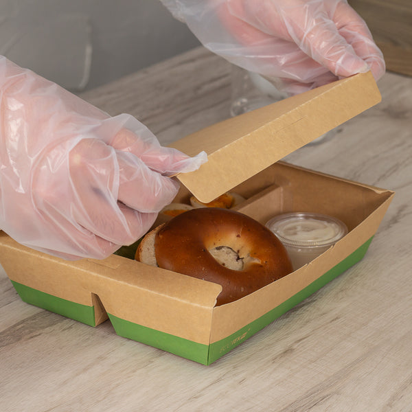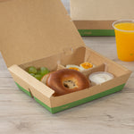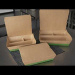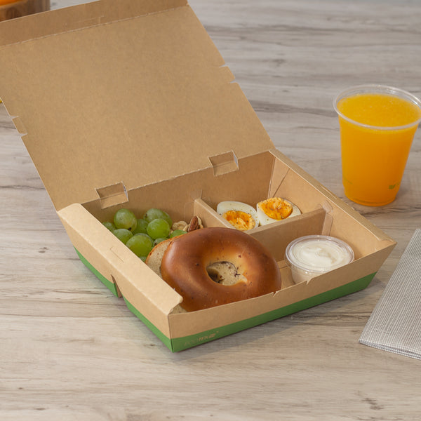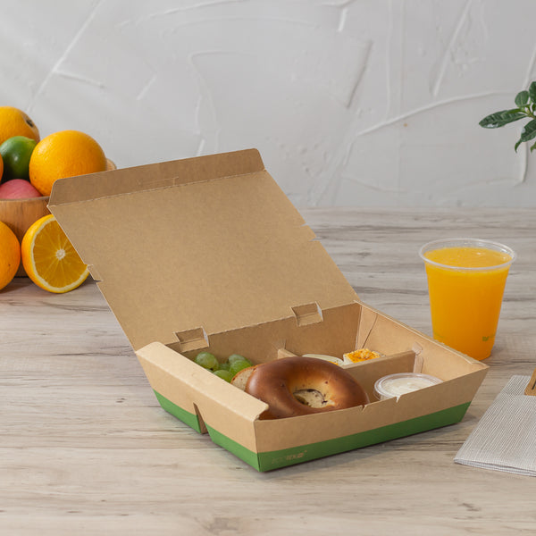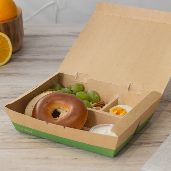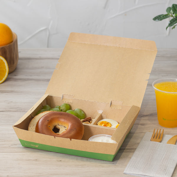 Use our Eco Tek 51-ounce Rectangle Kraft and Green Paper Bento Boxes for an eco-friendly way to package meals. Constructed from high-quality paper, these take away boxes are commercially compostable for a nature-friendly alternative to traditional food containers. These rectangular food boxes have a cornstarch-based PLA plastic lining to lock in oily and greasy meals and eliminate messes. These eco-friendly bento boxes have 3 built-in compartments, allowing you to neatly organize 1 main dish and 2 sides in the same container to create an enticing food presentation. With a tab lock closure, these commercially compostable food boxes keep ready-to-eat meals intact and protected during transport. Featuring a kraft and green finish, these disposable food boxes give your food orders an earth-friendly look to match the sustainability standards followed at your foodservice establishment. Containing up to 51 ounces, these grease-resistant food boxes measure 9.5 inches long by 7.5 inches wide by 2 inches tall. Sold in a 100 count box.