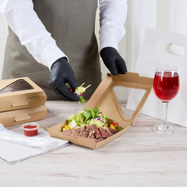 Give your takeout a new look with our Eco Tek Square Kraft Paper Corrugated Clamshell Containers. Designed with a corrugated pattern, these clamshell boxes provide superior heat retention while their durable build guards against crushing during transit. The conveniently placed side vents on these kraft clamshell boxes promote air circulation, keeping your burgers, wraps, or salads as fresh as when they leave your kitchen. With a clear window on top, these clamshell cardboard boxes allow staff and customers to quickly verify orders without opening the box, speeding up service and ensuring accuracy. Additionally, these disposable food containers stack conveniently, making storage simple and efficient. Crafted from recyclable materials, these paper clamshell containers help you uphold your sustainability goals with each use. Measuring 6.5 inches long by 6.5 inches wide by 1.9 inches high, these disposable clamshell containers are perfect for any foodservice business. Sold in a 100 count box.