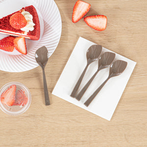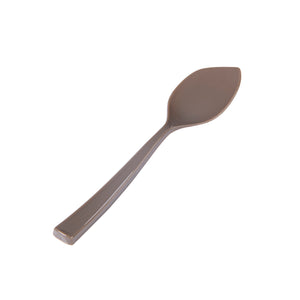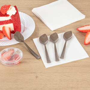 Offer a stylish solution for your bite-sized confectionary presentation with our Coppetta Fashion Gray Plastic Petal Spoons. Crafted from high-quality plastic, these frozen yogurt spoons boast exceptional durability, avoiding them from bending or breaking with ease. The robust and sturdy handles of these disposable spoons facilitate effortless scooping of tightly packed gelato or towering servings of icy sorbet. These dessert spoons have a distinctive angled design that ensure your customers can savor every delectable bite effortlessly. Adorned with a subtle gray hue, these cake spoons add a delightful touch to large bowls of hand-scooped ice cream and cups of freshly swirled frozen yogurt. These plastic spoons measure 4.5 inches in length by 1 inch in width, making them ideal for serving alongside all types of frozen treats and delectable desserts. Shipped in a 100 count box.