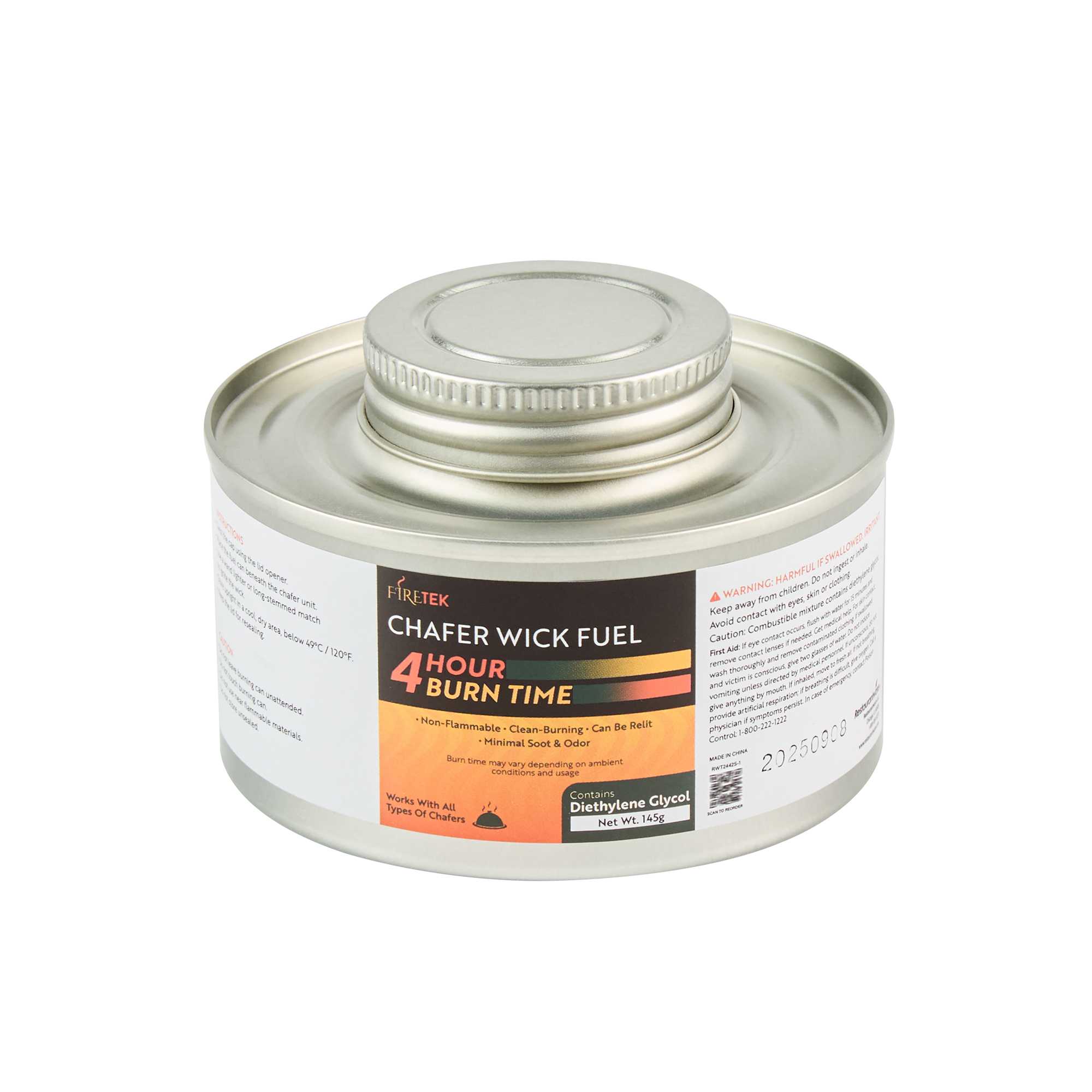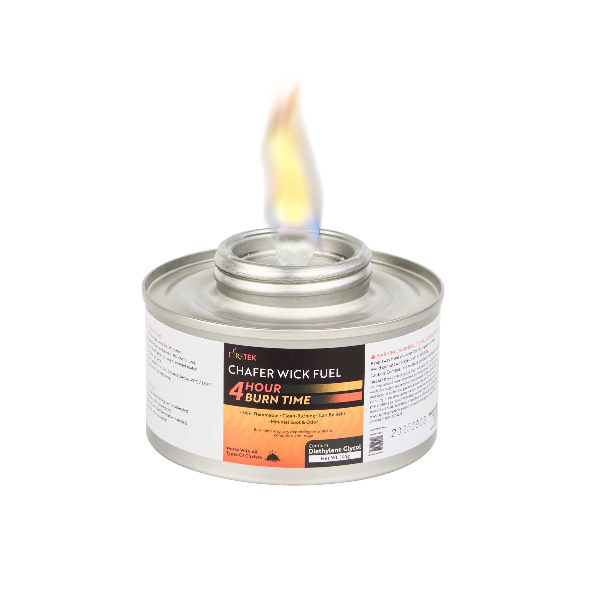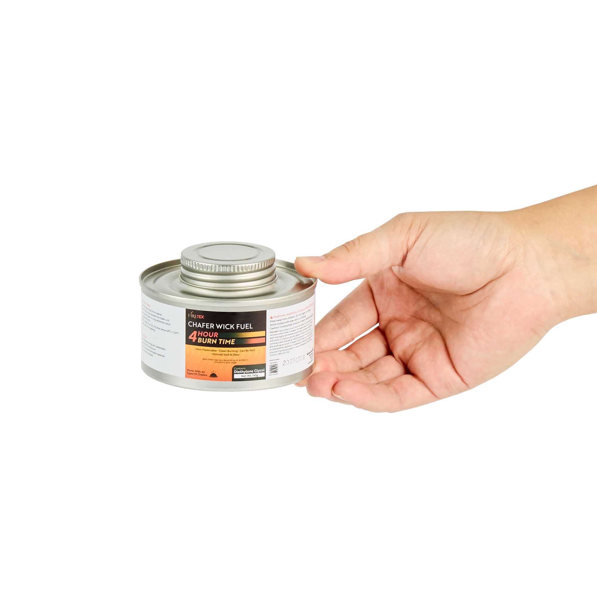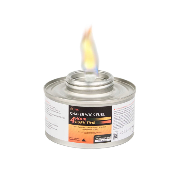 Ensure seamless service with clean-burning wick chafing fuel. The Fire Tek Clean-Burning Wick Chafing Fuel boasts an impressive four-hour duration, providing consistent heat while minimizing soot and odor release to simplify kitchen cleanup. Featuring a diethylene glycol burner, this food warming fuel ensures dishes remain hot and ready for timely service, enhancing customer satisfaction during buffet setups. Its convenient screw cap top offers safe storage, preventing spills and evaporation. Designed with a compact size of 10.63 inches by 6.89 inches, it fits seamlessly into any chafing dish setup, making it an indispensable tool for caterers and buffet managers seeking efficient and reliable food warming solutions. Elevate your foodservice operations and maintain the perfect serving temperature with this versatile food warming fuel. Each order includes 6 Fire Tek Non-Flammable Chafing Dish Fuels – Screw-Cap, Lid Opener.