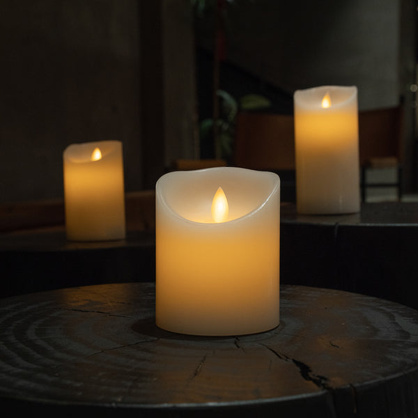 Add ambient lighting to your charming tablescape using our Fire Tek White Plastic Flameless Pillar Candles. Perfect for restaurants and catering events, these battery-powered candle mimic the warm glow of candlelight without the use of a lit flame. Crafted with high-quality paraffin wax, these battery-powered candle with a plastic base are built for long-lasting use, unlike typical wick candles. These battery-powered candles can be programmed to a timer to light up at your preferred time of day or night with our remote control (SKU: RWT0610). This charming candle also has a switch on its plastic base, providing you with an easy way to turn it on and off after use. These fake candle are designed to look like a melting candle, have a white finish, and feature a flickering flame to add an elegant touch to any centerpiece or table arrangement. For an added layer of protection against scratches or dents, these flicking candle come wrapped in plastic. Measuring 3.25 inches in length by 3.25 in diameter by 4 inches in height, these candle require 3 AAA batteries to operate. These flickering candle are available in a 1 count box. Batteries not included. Remote control is available and sold separately.