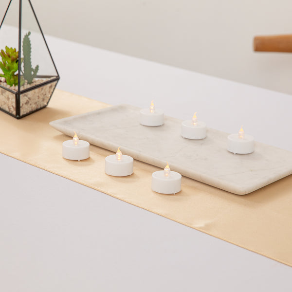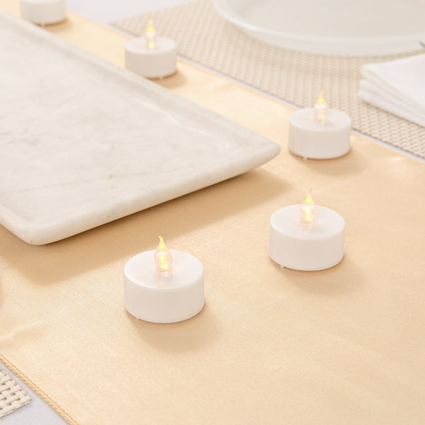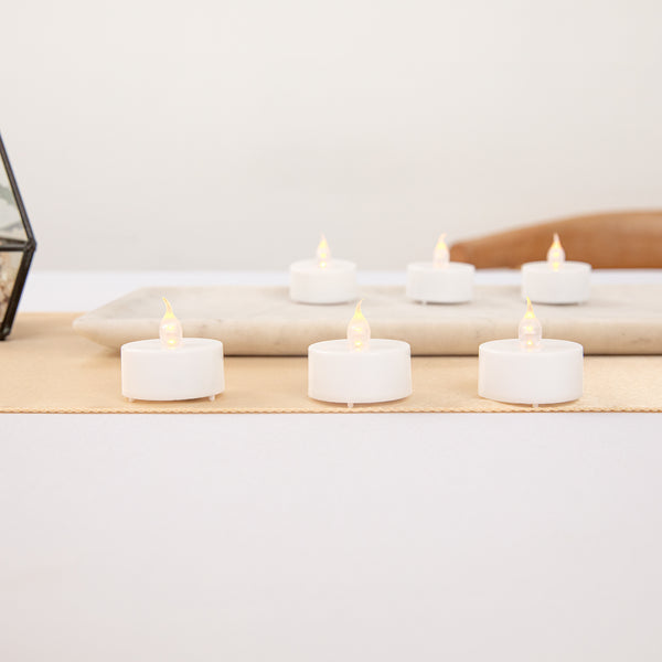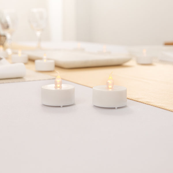 Create a warm glow at your table without the worry of spilled wax using our Fire Tek White Plastic Flameless Tea Candles. These led tea lights are perfect for decorating centerpieces at restaurants, weddings, or catered events. Crafted from high-quality plastic, these battery tea lights have a small rounded shape and realistic led flame. These flameless tea lights are naturally flickering to mimic the glimmer of traditional wick tea lights. Ideal for keeping tables well-lit throughout the day or night, these led tea lights are long-lasting. Plus, these battery tea lights won’t melt or cause messes at your event. Easily switch these flameless tea lights on and off with the button located at the base of these candles. These led tea lights measure 1.5 inches in width and 1.25 inches in height. Button cell batteries are included. Available in a 10 count box.