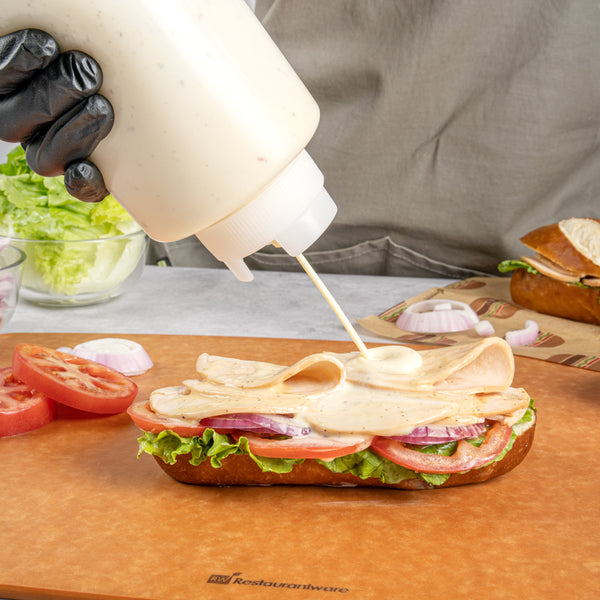 With a silicone dispensing valve, these squeeze bottles are perfect for thick sauces such as ranch dressing or mayonnaise. Plus, the valve automatically seals itself when not in use to keep sauces from leaking out.