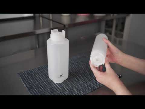 Each condiment bottle has a lid on the bottom to easily fill them from the base and ensure remaining sauces are dispensed first. Store the bottles upright for optimal performance.