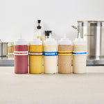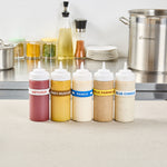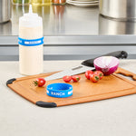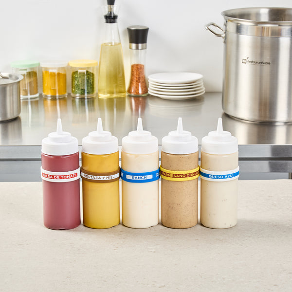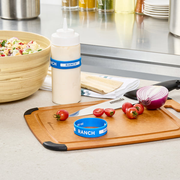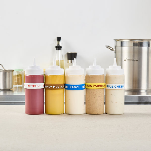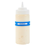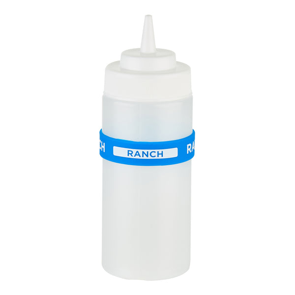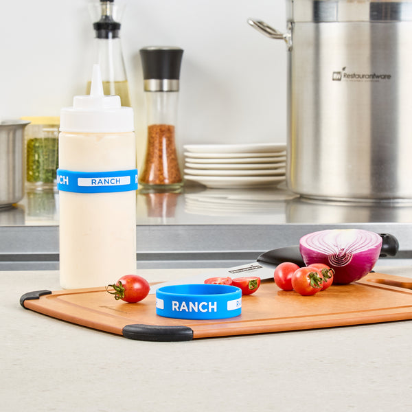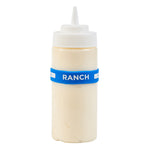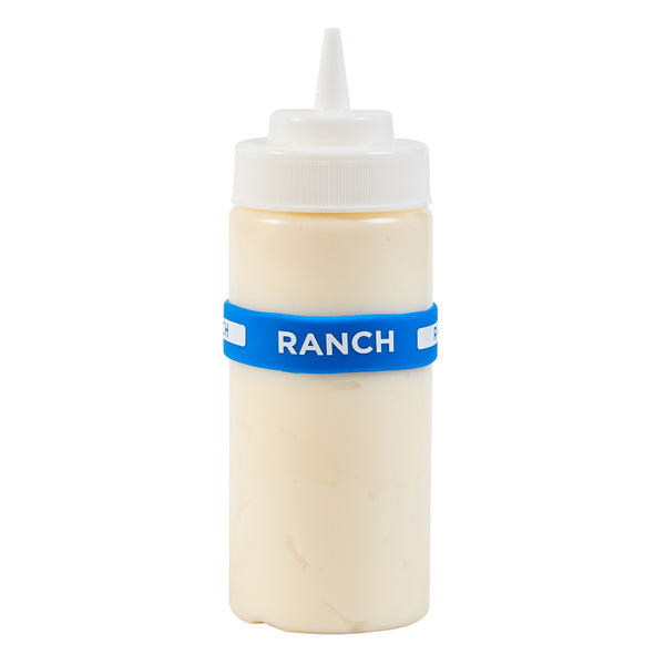 Enhance kitchen efficiency with versatile labeling solutions. The First In First Out Silicone Squeeze Bottle Band offers a durable silicone band that provides additional grip, reducing drops and spills in busy kitchen environments. Its color-coded design, clearly labeled "Ranch," ensures proper ingredient use and minimizes labeling errors, making it an essential silicone condiment label for consistent recipes. Measuring 2.75 inches by 2.75 inches by 0.75 inches, this squeeze bottle accessory is designed to fit 16, 20, and 24 ounce bottles, offering flexibility and compatibility with commonly used sizes. Made from silicone, it won’t disintegrate or contaminate food, ensuring non-contaminating storage solutions in foodservice operations. Plus, the dishwasher-safe feature saves time and labor during cleanup, supporting sustainable practices by enabling easy maintenance and reuse. Each order includes 10 First In First Out Silicone Squeeze Bottle Bands.