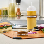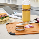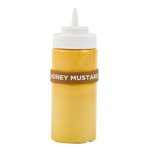 Efficiently organize condiments with these versatile squeeze bottle labels. The First In First Out Brown Silicone Honey Mustard Label Band ensures clear condiment identification, reducing mix-ups during service. Designed to fit 16, 20, and 24-ounce squeeze bottles, this silicone condiment band offers a versatile fit that adapts to various bottle sizes, enhancing operational flexibility. The durable silicone material provides additional grip, ensuring secure handling even in fast-paced environments, while its clearly printed labels promote proper ingredient use, minimizing errors. Its color-coded design aids in easy identification and streamlines kitchen organization, making it ideal for fast-food restaurants and catering services. The stretchable, heat-resistant band withstands frequent washing and high-heat conditions, ensuring long-term use without compromising on food safety. Each order includes 10 First In First Out Brown Silicone Honey Mustard Label Bands.