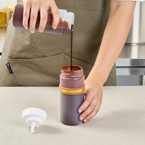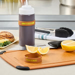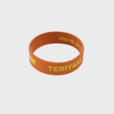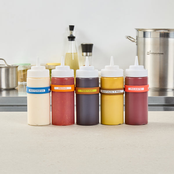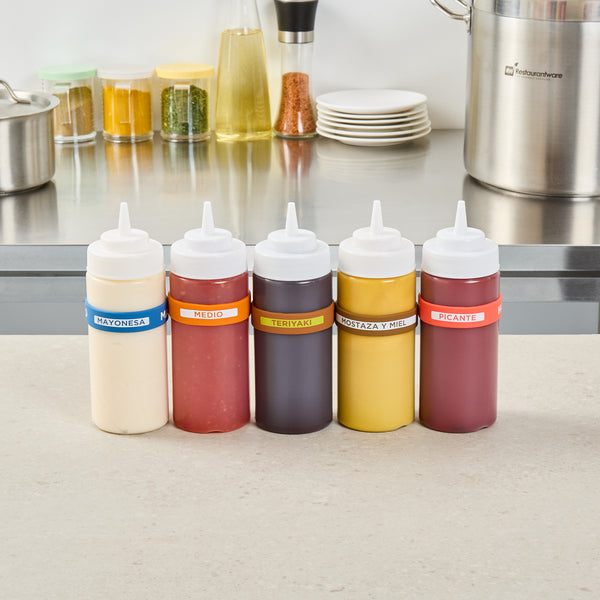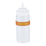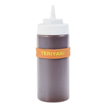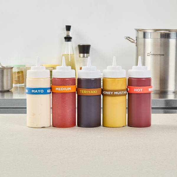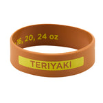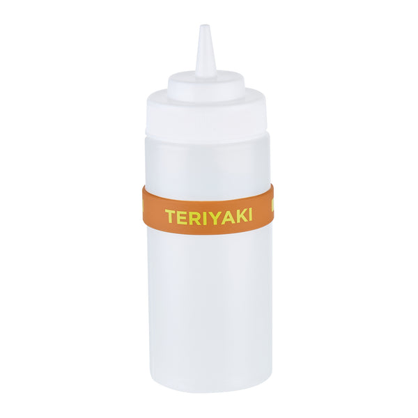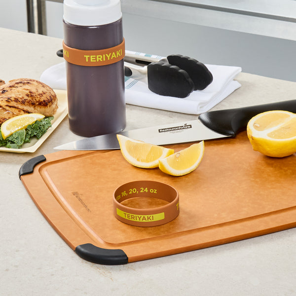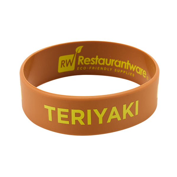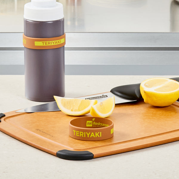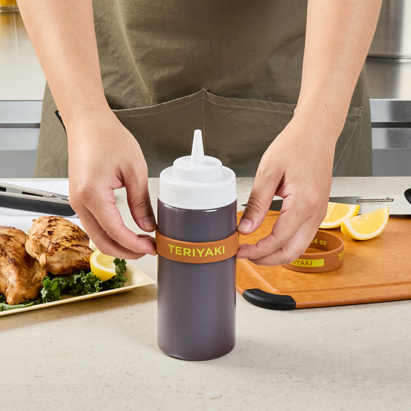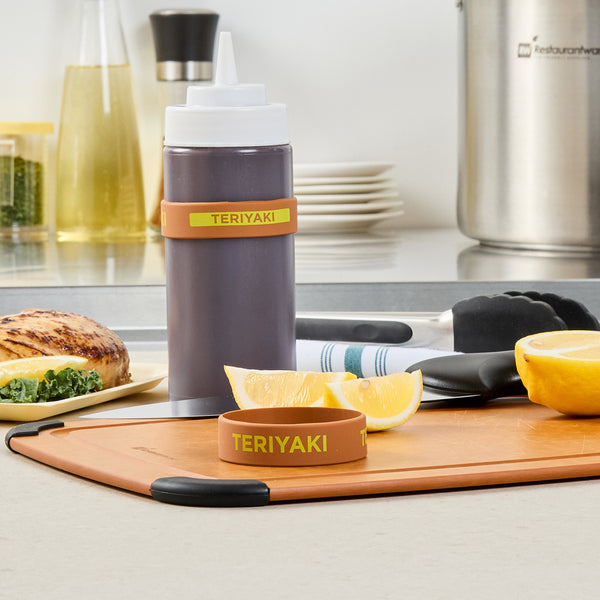 Enhance food safety with our First In First Out Silicone Squeeze Bottle Band. This brown silicone squeeze bottle band is labeled "Teriyaki," ensuring quick identification and reducing cross-contamination risks in busy kitchens. Its durable silicone material withstands frequent use and cleaning, maintaining legibility over time, while the color-coded design prevents condiment bottle label errors, supporting operational efficiency. Measuring 2.75 inches in both length and width, this stretchable bottle band fits seamlessly on 16, 20, and 24-ounce squeeze bottles, providing additional grip and control. The band’s dishwasher-safe feature allows for efficient and quick cleaning, streamlining maintenance routines and ensuring food safety compliance. Equip your condiment stations with these versatile bands to ensure accurate sauce dispensing and maintain high food safety standards. Each order includes 10 First In First Out Silicone Squeeze Bottle Bands.