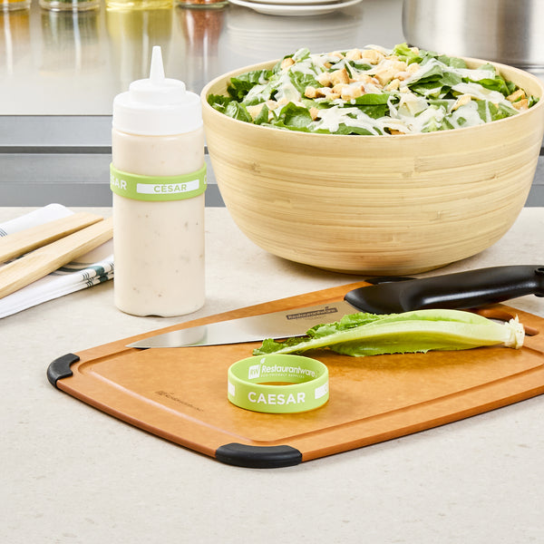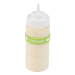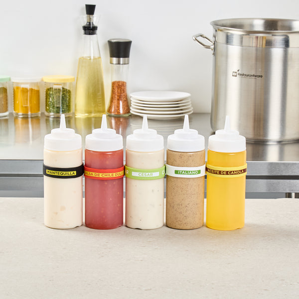 Enhance kitchen efficiency with easy-to-identify squeeze bottle labels. The First In First Out Silicone Bottle Band is crafted from durable silicone, providing a secure grip to prevent accidental spills and mislabeling in busy kitchen environments. Its color-coded design ensures proper ingredient use and reduces errors, making it an essential condiment label band for commercial kitchens. Versatile enough to fit 16, 20, and 24-ounce bottles, it seamlessly integrates into any foodservice operation, ensuring consistent and clear identification of Caesar dressing bottles. The band’s 2.75-inch size allows for easy application and removal, facilitating quick changes and maintaining hygiene standards. This silicone construction resists disintegration and contamination, boosting the longevity of your kitchen supplies. Reinforce your kitchen organization and reduce operational errors with this indispensable squeeze bottle label. Each order includes 10 First In First Out Silicone Bottle Bands.