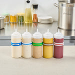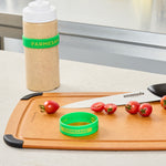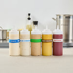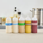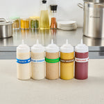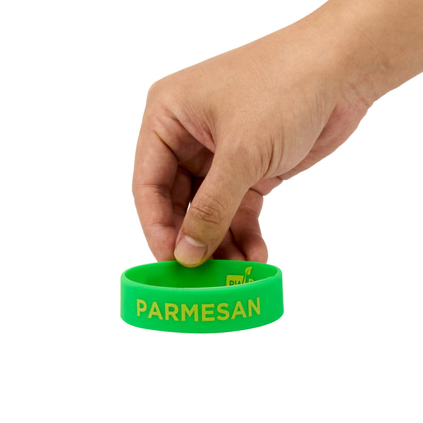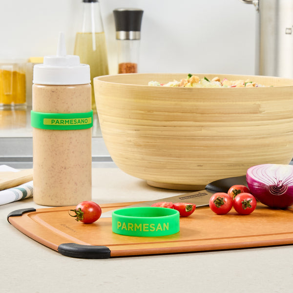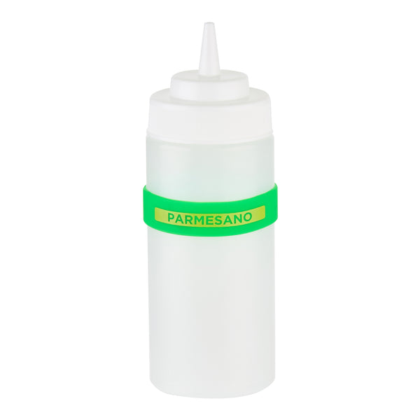 Enhance kitchen efficiency with easy-to-read condiment identifiers. The First In First Out Silicone Squeeze Bottle Label Band is a green silicone squeeze bottle label band that clearly marks bottles containing Parmesan cheese, minimizing misidentification and cross-contamination. This versatile condiment label band fits 16, 20, and 24 ounce squeeze bottles, ensuring seamless integration into any kitchen setup. Crafted from durable silicone, it provides additional grip for secure handling and withstands frequent use, making it an ideal kitchen condiment identifier. Its color-coded design ensures proper ingredient use and reduces errors, streamlining food preparation processes. Dishwasher safe, this label band allows for easy and efficient cleaning, further optimizing kitchen operations. Elevate your foodservice experience with this essential kitchen tool. Each order includes 1 First In First Out Silicone Squeeze Bottle Label Band.
