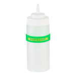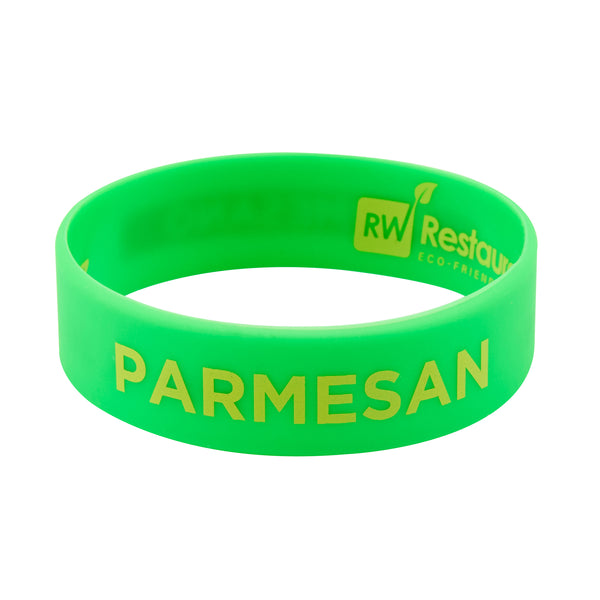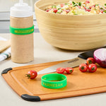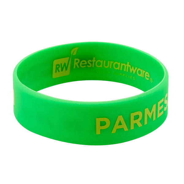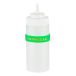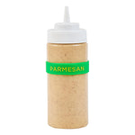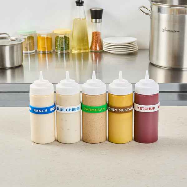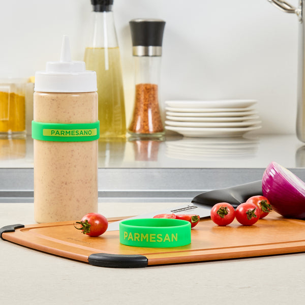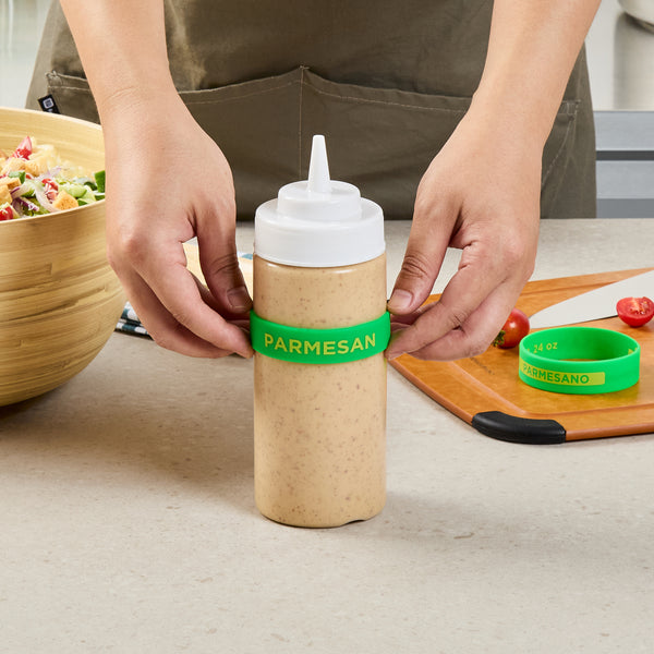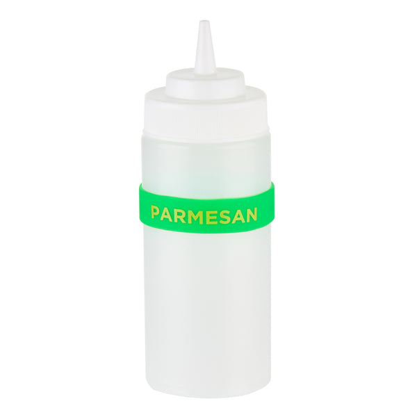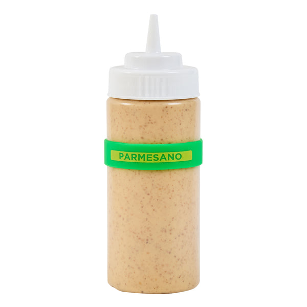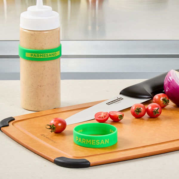 Enhance kitchen efficiency with easy-to-read condiment identifiers. The First In First Out Silicone Squeeze Bottle Label Band is a green silicone squeeze bottle label band that clearly marks bottles containing Parmesan cheese, minimizing misidentification and cross-contamination. This versatile condiment label band fits 16, 20, and 24 ounce squeeze bottles, ensuring seamless integration into any kitchen setup. Crafted from durable silicone, it provides additional grip for secure handling and withstands frequent use, making it an ideal kitchen condiment identifier. Its color-coded design ensures proper ingredient use and reduces errors, streamlining food preparation processes. Dishwasher safe, this label band allows for easy and efficient cleaning, further optimizing kitchen operations. Elevate your foodservice experience with this essential kitchen tool. Each order includes 10 First In First Out Silicone Squeeze Bottle Label Bands.