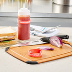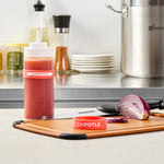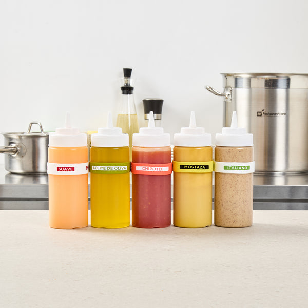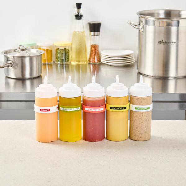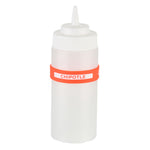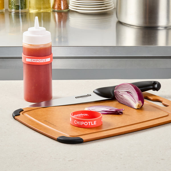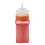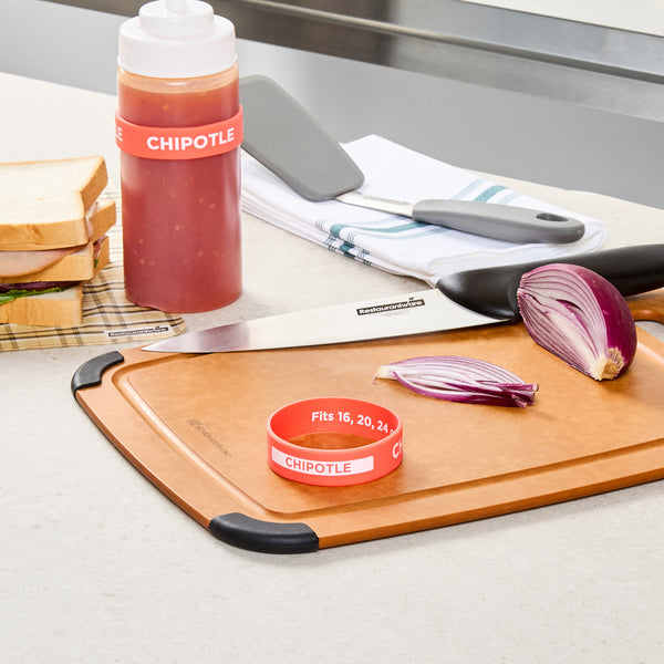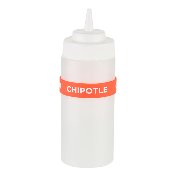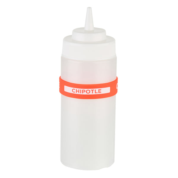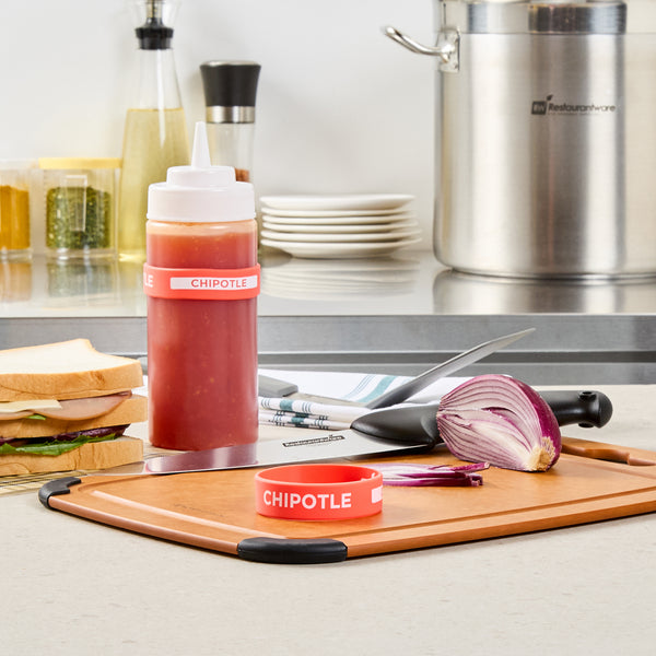 Ensure efficient kitchen operations with the First In First Out Squeeze Bottle Band. This silicone condiment band, measuring 2.75 inches by 2.75 inches, is crafted from durable silicone, providing an additional grip that secures handling during busy shifts. Its color-coded red design prominently labeled "Chipotle" enhances condiment identification, ensuring proper ingredient use and significantly reducing errors in fast-paced environments. Compatible with 16, 20, and 24 ounce squeeze bottles, this band offers versatile compatibility and streamlines inventory management for quick-service restaurants and catering services. Dishwasher safe, this squeeze bottle band facilitates efficient cleaning, promoting hygiene and saving valuable time and labor costs. Elevate your foodservice efficiency with this essential kitchen accessory, perfect for maintaining organized and hygienic condiment stations. Each order includes 1 First In First Out Squeeze Bottle Band.