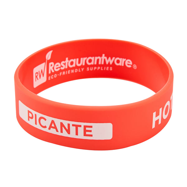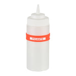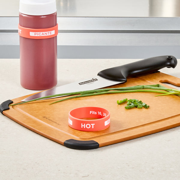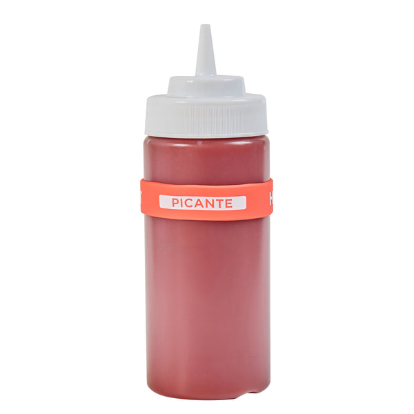 Enhance condiment identification with the First In First Out Silicone Squeeze Bottle Band. This red silicone band features a prominent "HOT" imprint, clearly marking spicy or hot condiments to reduce the risk of misidentification. Designed to fit 16, 20, and 24-ounce squeeze bottles, this condiment organization band ensures versatile compatibility across various kitchen setups. Crafted from durable silicone, it provides additional grip, preventing spills and maintaining a clean workspace. The dishwasher-safe design facilitates easy cleanup, saving valuable time in busy kitchens. With dimensions of 2.75 inches in length and width, it offers flexibility in ingredient use without compromising on functionality. This hot condiment label is ideal for fast-food restaurants, catering services, and buffet setups, ensuring proper ingredient use and reducing errors. Elevate your condiment station's efficiency and hygiene. Each order includes 10 First In First Out Silicone Squeeze Bottle Bands.