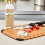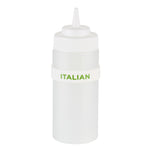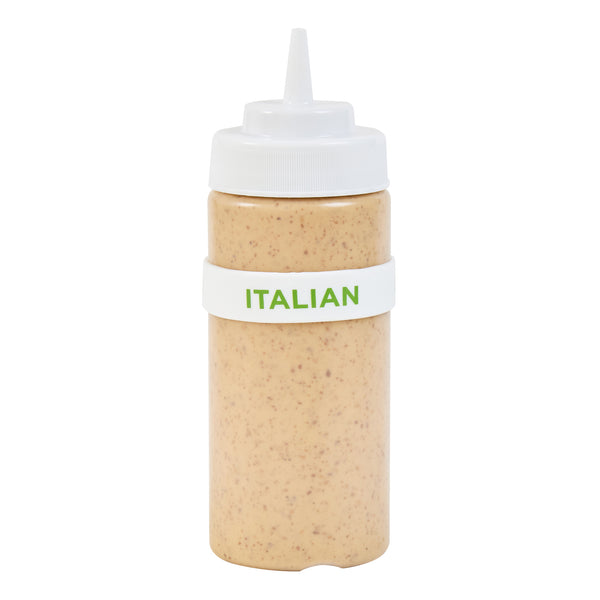 Ensure optimal freshness with the First In First Out Silicone Label Band. Designed to fit 16, 20, and 24-ounce squeeze bottles, this silicone label band enhances kitchen efficiency. Featuring a durable silicone construction, this condiment label band withstands frequent use in busy kitchen environments and provides additional grip to prevent bottle slips. The clearly printed Italian labels ensure accurate ingredient identification, reducing errors. With dimensions of 2.75 inches by 2.75 inches and a height of 0.75 inches, this label band for squeeze bottles offers a versatile fit across various container sizes, making it an invaluable tool for culinary professionals. Its easy application and removal facilitate quick changes and cleaning, helping maintain high hygiene standards. Enhance your kitchen's operational efficiency with this essential food safety tool. Each order includes 10 First In First Out Silicone Label Bands.