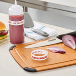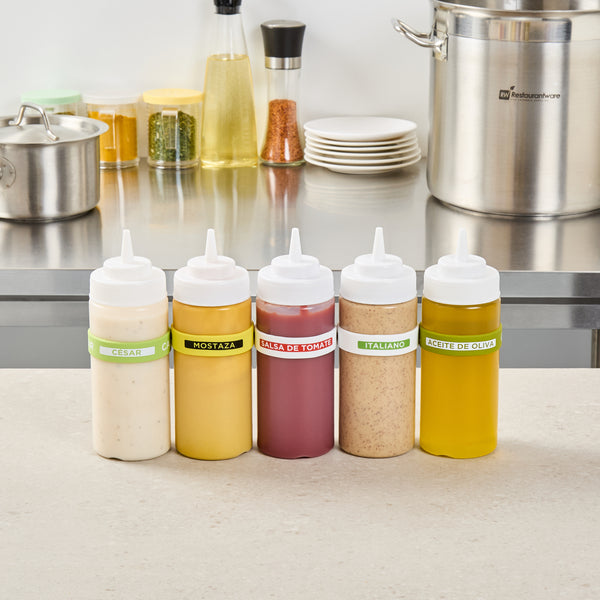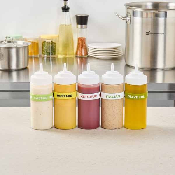 Enhance kitchen efficiency with reliable ingredient management. The First In First Out Silicone Squeeze Bottle Band ensures proper product rotation, reducing waste and maintaining freshness in every kitchen operation. Constructed from durable silicone, this condiment bottle grip band provides a long-lasting labeling solution that withstands frequent use and cleaning, while offering additional grip for secure handling. Its versatile compatibility fits 16, 20, and 24-ounce bottles, simplifying inventory management and making it an ideal choice for busy foodservice environments. The food safety label band is dishwasher safe, which simplifies cleanup in bustling kitchens, allowing staff to focus on service. With color-coded labels, it ensures proper ingredient use and reduces errors, enhancing food safety practices. These 2.75-inch by 2.75-inch by 0.75-inch bands are white for clear visibility, aiding in quick identification. Each order includes 1 First In First Out Silicone Bottle Band.