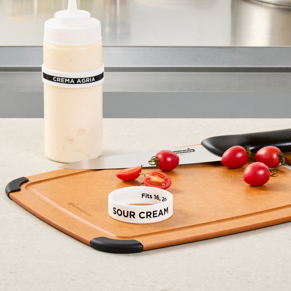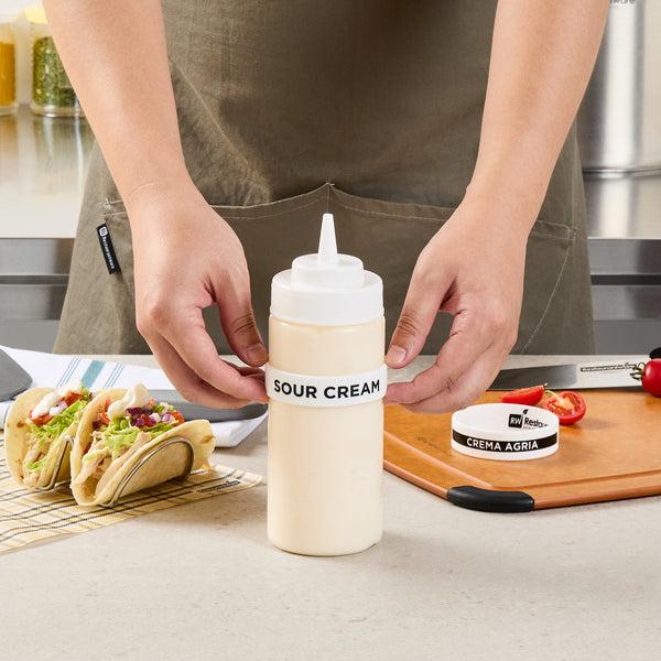 Enhance condiment management with reliable labeling solutions. The First In First Out Silicone Squeeze Bottle Label offers an ergonomic grip with its durable silicone construction, ensuring longevity and resistance to wear in busy foodservice environments. Designed to fit 16, 20, and 24-ounce squeeze bottles, this condiment identification band provides versatility and compatibility with commonly used bottle sizes. Its dishwasher-safe feature allows for quick and efficient cleaning, ideal for maintaining hygiene in commercial kitchens. The color-coded "Sour Cream" label facilitates proper ingredient use, reducing errors and enhancing kitchen efficiency. With dimensions of 2.75 inches by 2.75 inches, this silicone condiment band is clearly labeled for sour cream, enabling fast and accurate product identification. Ensure seamless condiment organization and minimize waste by utilizing this essential tool. Each order includes 10 First In First Out Silicone Squeeze Bottle Labels.