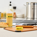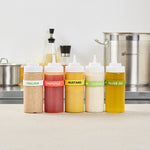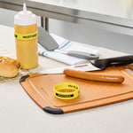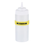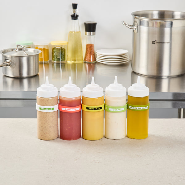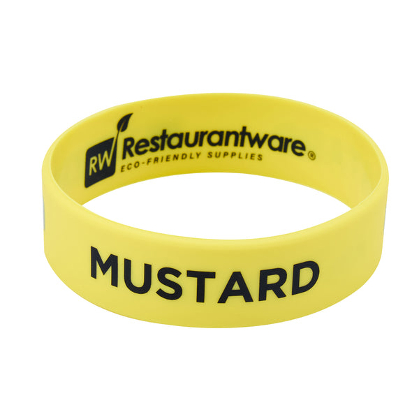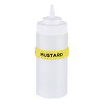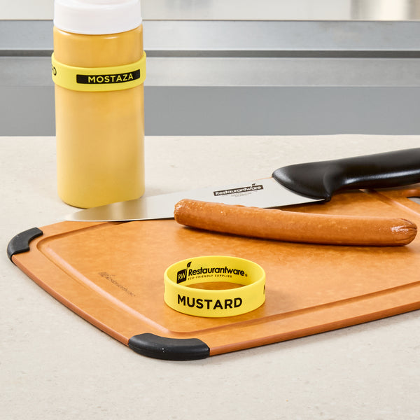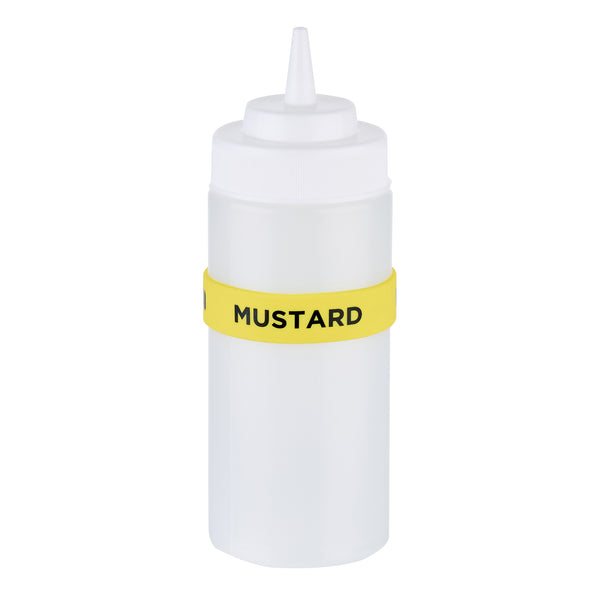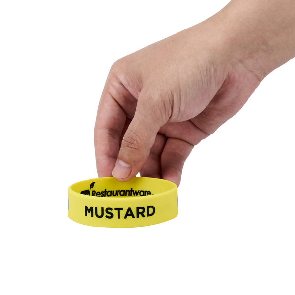 Streamline condiment identification with durable labeling solutions. The First In First Out Silicone Squeeze Bottle Band features a bright yellow silicone band marked "Mustard," providing quick and easy identification to reduce service errors in fast-paced environments. This condiment label band fits 16, 20, and 24-ounce bottles, offering versatility across multiple condiment sizes and improving inventory management in kitchens. Made from durable silicone, this silicone bottle label is designed to withstand frequent use and cleaning, ensuring it remains a reliable part of your foodservice operations. The band measures 2.75 inches in length, making it easy to apply and remove, thus enhancing operational efficiency during busy shifts. Trust this functional and dishwasher-safe tool to maintain order and accuracy in your condiment stations. Each order includes 1 First In First Out Silicone Squeeze Bottle Band.