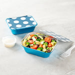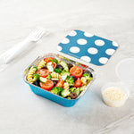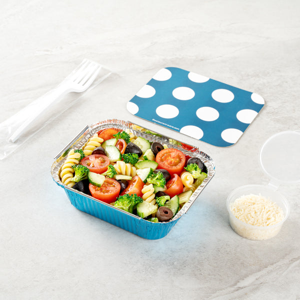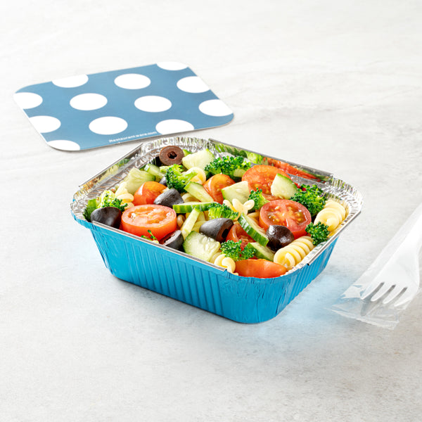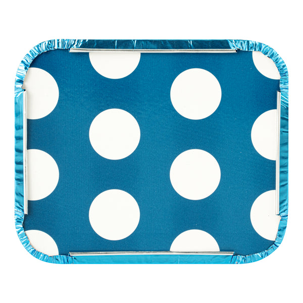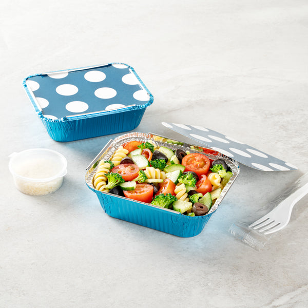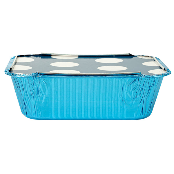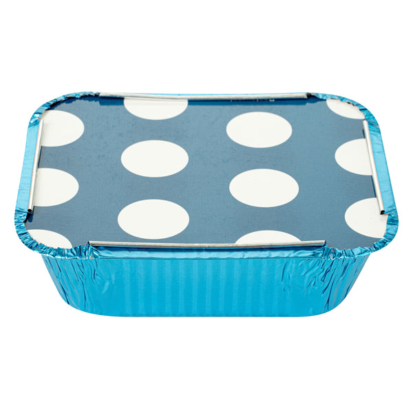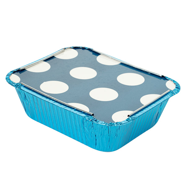 12 OZ BLUE ALUMINUM TAKE OUT CONTAINER - WITH POLKA DOT PAPER LID