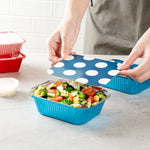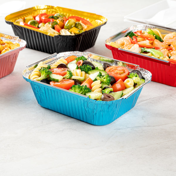 Pump up the character and functionality of your food delivery service with our Foil Lux 12-Ounce Rectangle Blue Aluminum Take Out Containers. Radiating a bold blue hue, these freezable aluminum take out containers infuse a sense of thrill into the meal delivery journey. Accompanied by a charming polka dot paper lid, these oven-ready food containers contribute significantly to their visual allure. Built tough, these disposable take out containers are composed of premium aluminum, ensuring their resilience in the face of delivery challenges, all while retaining their form. The silver foil lining of these recyclable food storage containers assists in sustaining the warmth of hot contents, cementing the culinary fulfillment of your customers. Bearing in mind user convenience, these blue takeaway containers have been disposable, downsizing post-meal cleaning duties. Measuring 5.75 inches in length by 4.75 inches in width by 1.75 inches in height and containing up to 12 ounces, these takeaway containers nicely pack a substantial serving. Sold in a 200 count box.