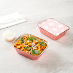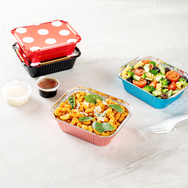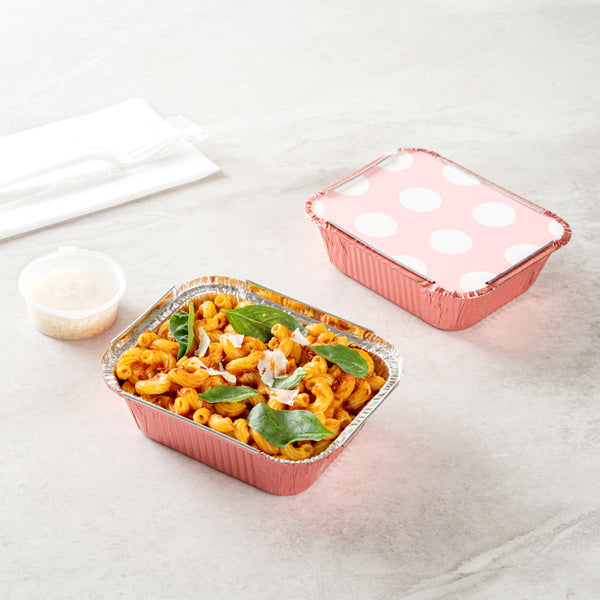 Add a dash of style and convenience to your to-go food orders with our Foil Lux 12-Ounce Rectangle Pink Aluminum Take Out Container. These aluminum take out containers sport an eye-catching pink shade, lending a touch of elegance to your food delivery orders. The polka dot paper lid adds a playful touch to these disposable food containers, ideal for caterers, takeaways, and food trucks alike. These food containers, made from durable aluminum, are strong enough to withstand the rigors of delivery without losing shape or integrity. Lined with silver foil, these disposable take out containers not only look good but also retain the heat of your hot foods, ensuring your customers enjoy meals just as you intended. Designed for simplicity, these take out containers are disposable, saving your customers the hassle of cleaning up. Measuring 5.75 inches in length by 4.75 inches in width by 1.75 inches in height and containing up to 12 ounces, these takeaway containers nicely pack a substantial serving. Sold in a 50 count box.