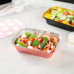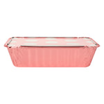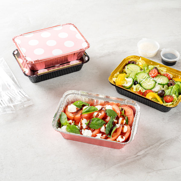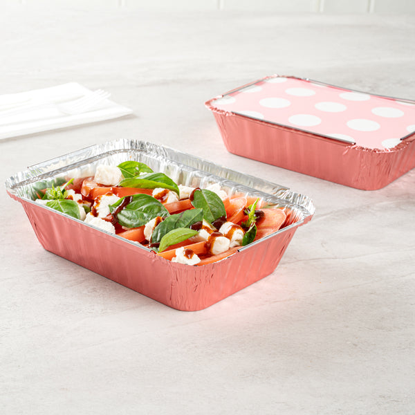 Accentuate your food delivery orders with our Foil Lux 16-Ounce Rectangle Pink Aluminum Take Out Container. The striking pink shade of these aluminum containers provides a dose of elegance to your service. The delightful polka dot paper lid of these recyclable take out containers complements the overall aesthetic. Impressively sturdy, these pink take out containers can withstand the wear and tear of transportation without losing their firm structure. The silver foil lining of these freezable containers manages to keep hot food at an optimum temperature, ensuring the customers relish their meals as intended. Aimed at convenience, these oven-ready meal containers are disposable, relieving your customers from dishwashing duties. Measuring 7.25 inches long by 5.25 inches wide by 2 inches tall and containing up to 16 ounces, these rectangle take out containers generously accommodate substantial servings. Sold in a 50 count box.
