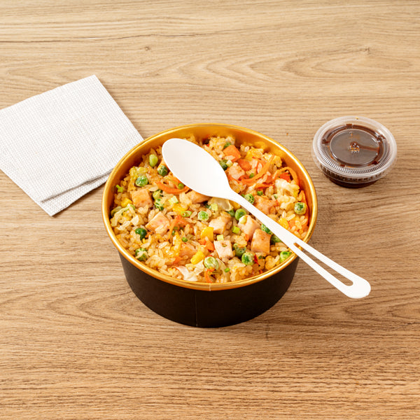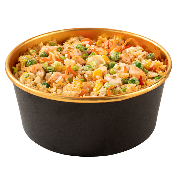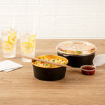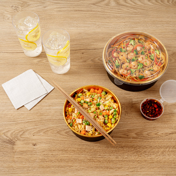 Keep guests' meals warm with our Foil Lux 25-ounce Black And Gold Foil Paper Take Out Containers. Designed with an interior foil lining, these to go containers are insulated to maintain the temperature and freshness of orders. Made from paper and aluminum foil, these greaseproof to go containers are great for packaging hot or cold foods. To protect orders during trasnport, these foil food containers are compatible with our Foil Lux lids (SKU: RWM0150C). These take away containers feature a black finish to seamlessly match your restaurant's theme or colors. To save space in your kitchen or storage area, these black to go containers are stackable. Measuring 6 inches in diameter by 2.25 inches in height, these paper take out containers can hold up to 25 ounces. Sold in a 50 count box. Compatible lids are available and sold separately.