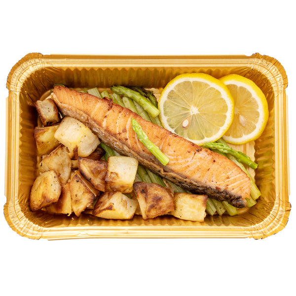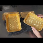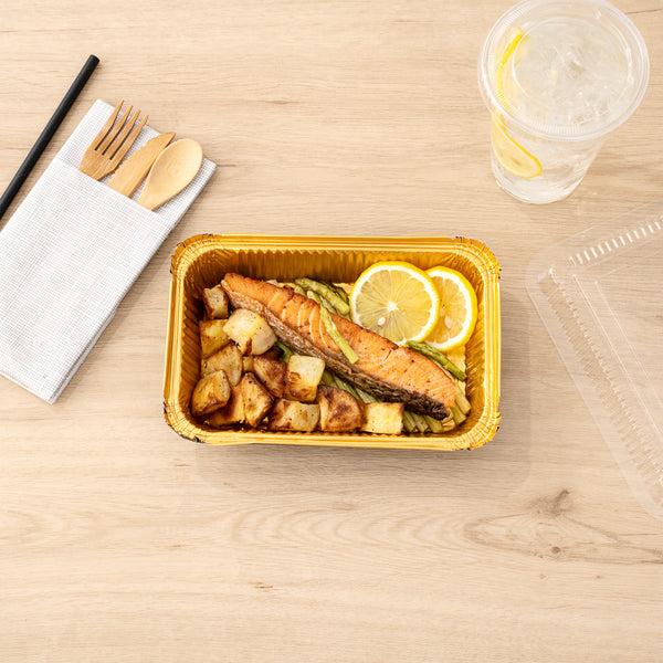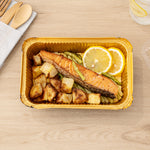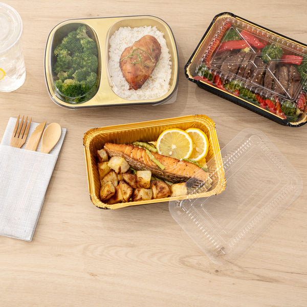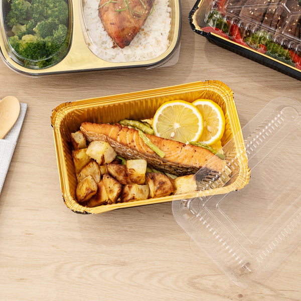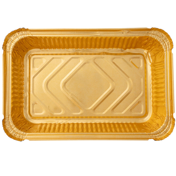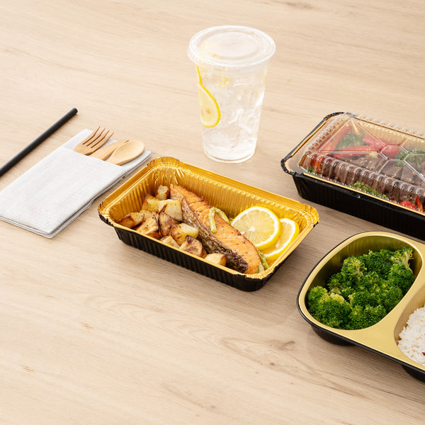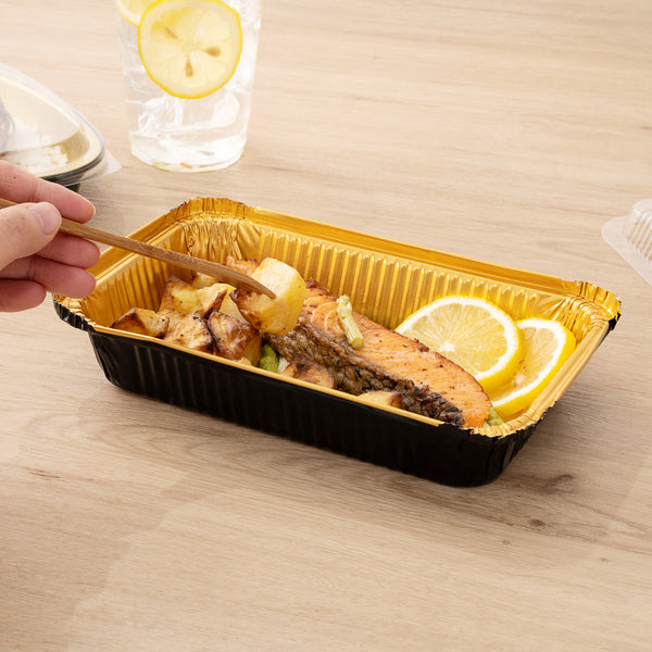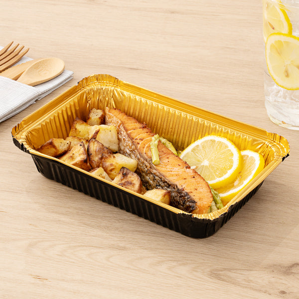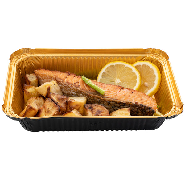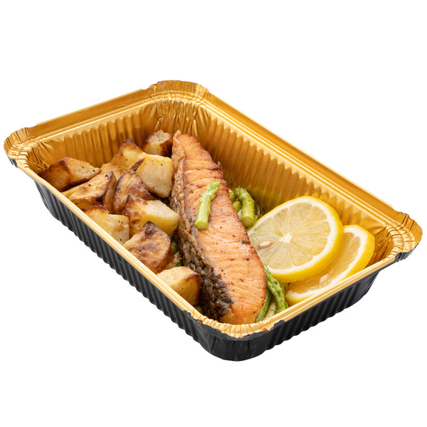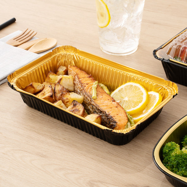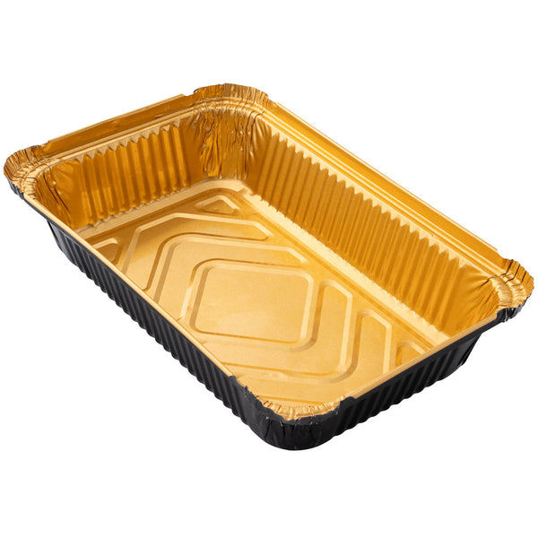 Bake, serve, and store all kinds of tasty entrees using our Foil Lux 27-ounce Rectangle Black and Gold Aluminum Containers. Perfect for elevating the look of your buffet tables and food stations, these aluminum trays have a classic black exterior and a luxurious gold interior. These foil containers are ideal for all-in-one use and are oven-safe up to 480F to conveniently bake and serve meals in the same tray. Designed with ridges at the base and sides, these disposable aluminum trays are perfect for maximizing convection and evenly distributing heat while cooking. The rolled rim of these foil containers provides a secure grip to prevent messy spills while in the oven or serving guests. Made with premium aluminum, these durable aluminum trays can hold large amounts of food without bending out of shape. To conveniently store leftovers, these disposable aluminum trays are freezer-safe. For a quick and easy cleanup, these foil containers can be recycled after use. To safely transport meals to catered events, pair these aluminum trays with our matching plastic lids. (SKU: RWM0115C) Measuring 8.25 inches in length by 5.75 inches in width by 1.5 inches in height, these disposable aluminum trays can hold up to 27 ounces of food. Shipped in a 200 count box.
